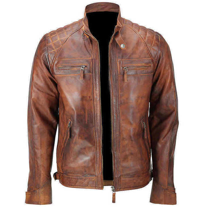แจ็คเก็ตหนังแท้สีดำสำหรับผู้ชายแบบสั่งทำ OEM ลายเพชรเย็บแบบควิลท์ แจ็คเก็ตนักขี่มอเตอร์ไซค์ เสื้อโค้ทหนังแท้ แฟชั่นฤดูใบไม้ร่วงฤดูหนาว ผลิตจากโรงงาน