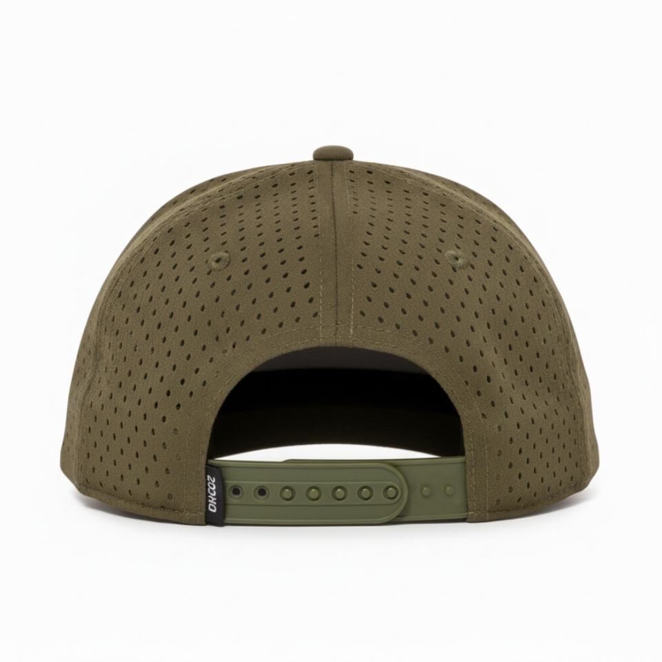 หมวกแก๊ปตาข่ายแบบกำหนดเอง OEM พร้อมโลโก้ 5 แผง ปีกโค้งเล็กน้อย แบบ Snapback ป้ายยางกันน้ำ หมวกกอล์ฟ