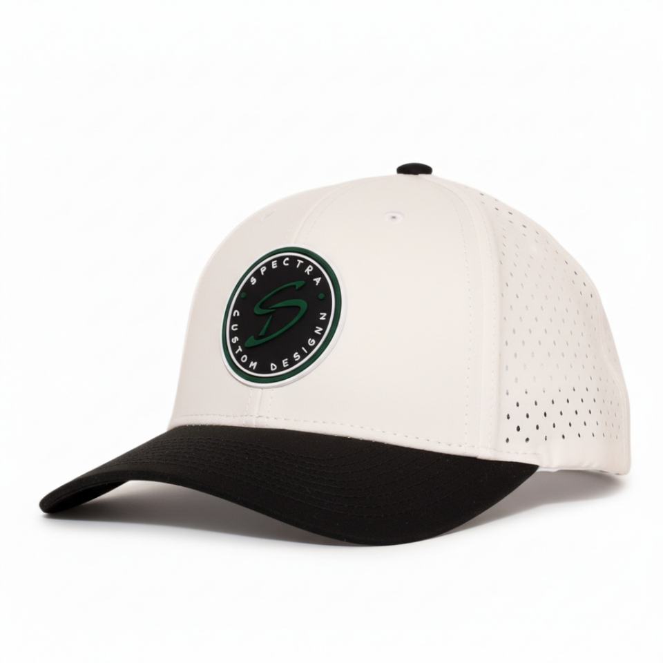 หมวกแก๊ปตาข่ายแบบกำหนดเอง OEM พร้อมโลโก้ 5 แผง ปีกโค้งเล็กน้อย แบบ Snapback ป้ายยางกันน้ำ หมวกกอล์ฟ