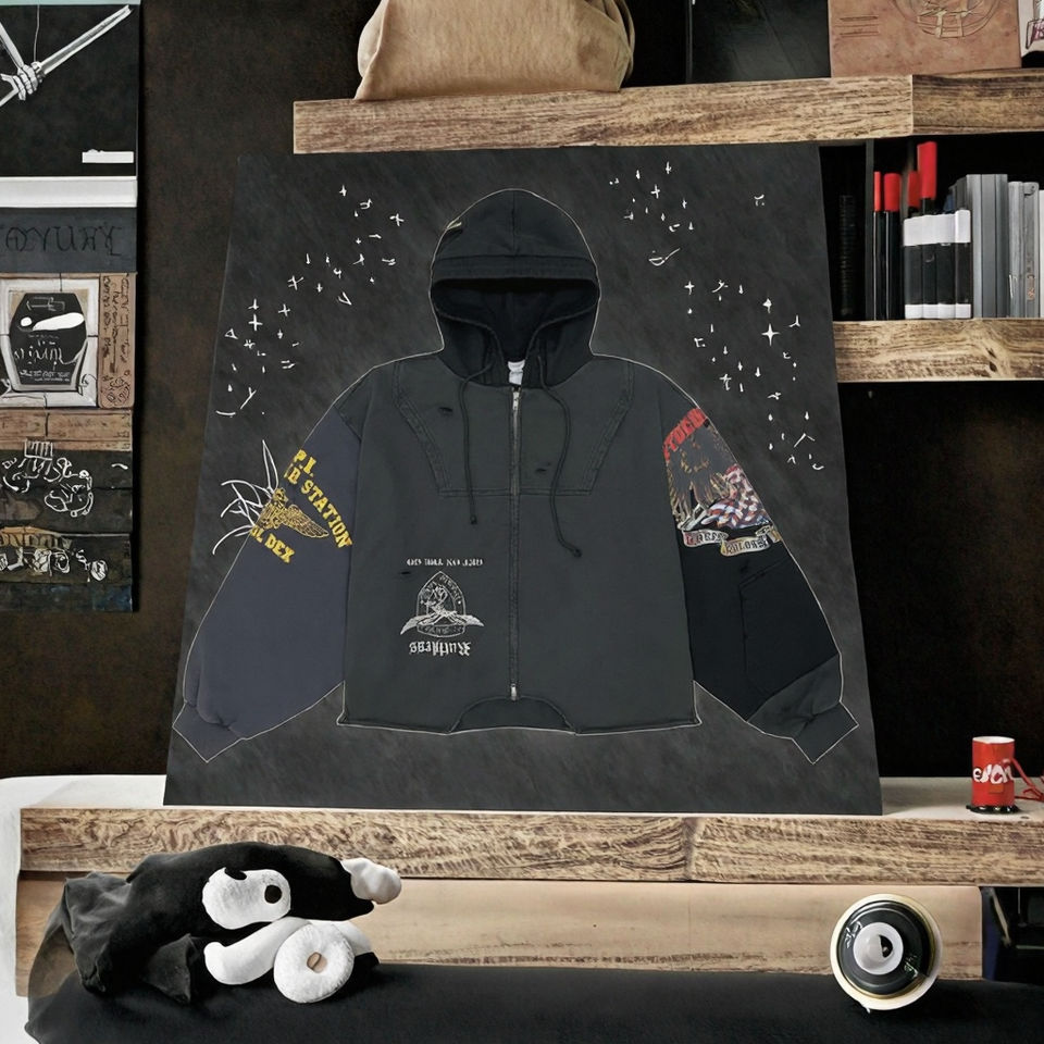 เสื้อฮู้ดซิปแบบใหม่ สไตล์แฟชั่น พิมพ์ลายแบบย้อนยุค ตัดต่อผ้าแบบวินเทจ ล้างสีแบบแอซิดวอช ทำสีซีดแบบดิสเทรส ผ้าฝ้าย 100% ปักลาย เป็นมิตรกับสิ่งแวดล้อม สำหรับฤดูใบไม้ร่วง ผลิตตามแบบ OEM