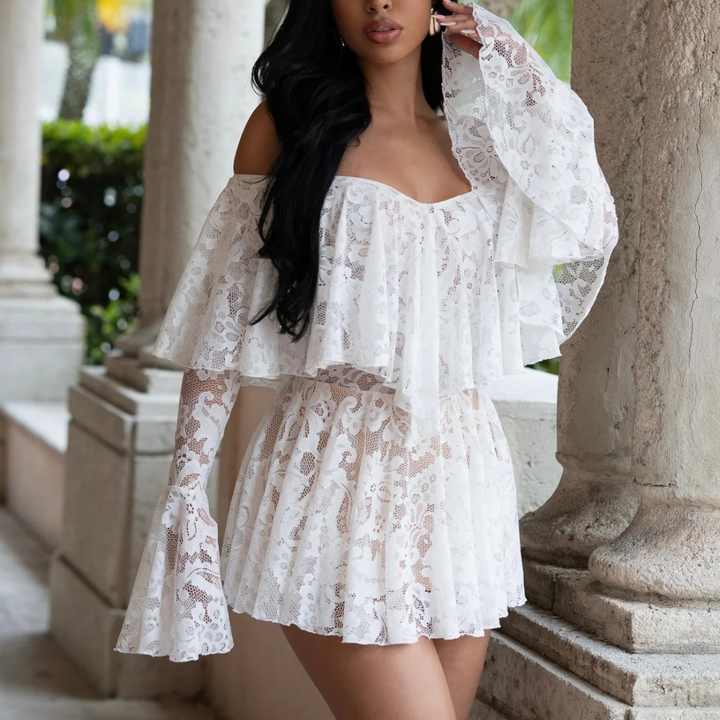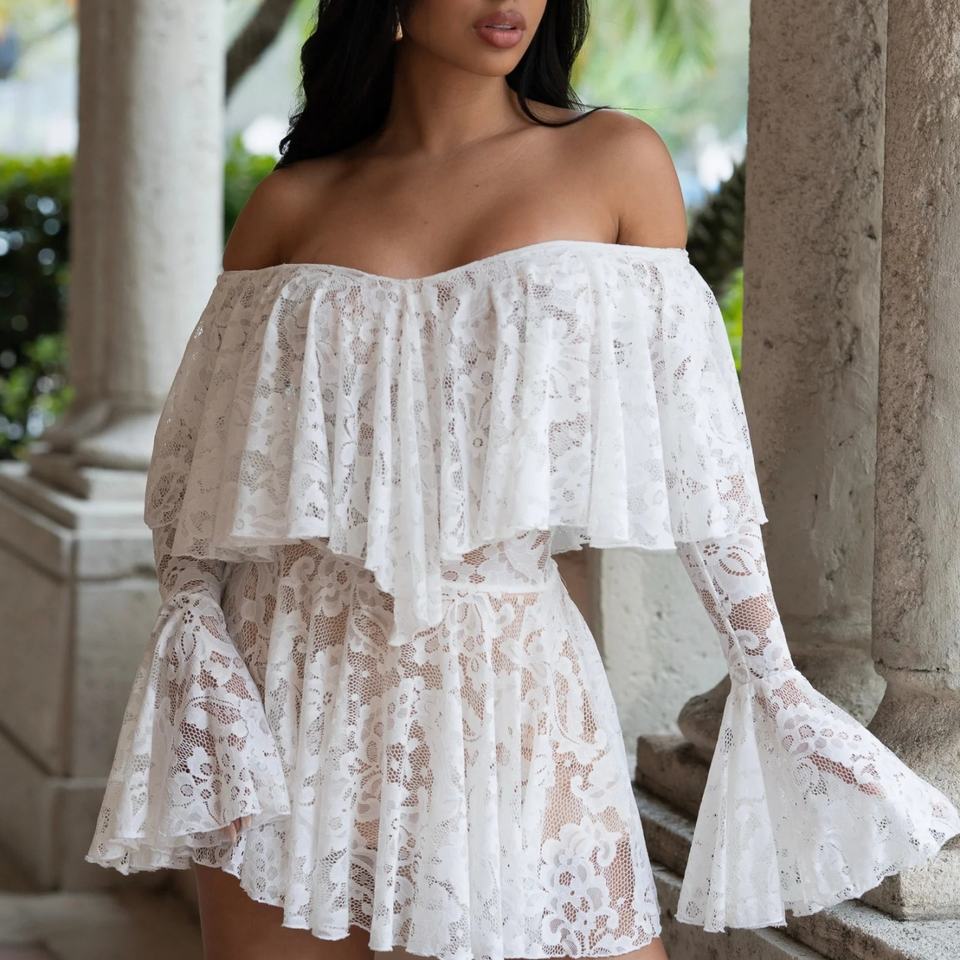 ชุดค็อกเทลทรงเอไลน์แขนบานระบายสองชั้นสีขาวล้วนแบบใหม่ปี 2026 สำหรับผู้หญิง ตกแต่งด้วยลูกไม้และดีไซน์เปิดไหล่ ผลิตตามแบบ OEM