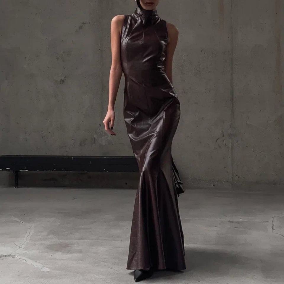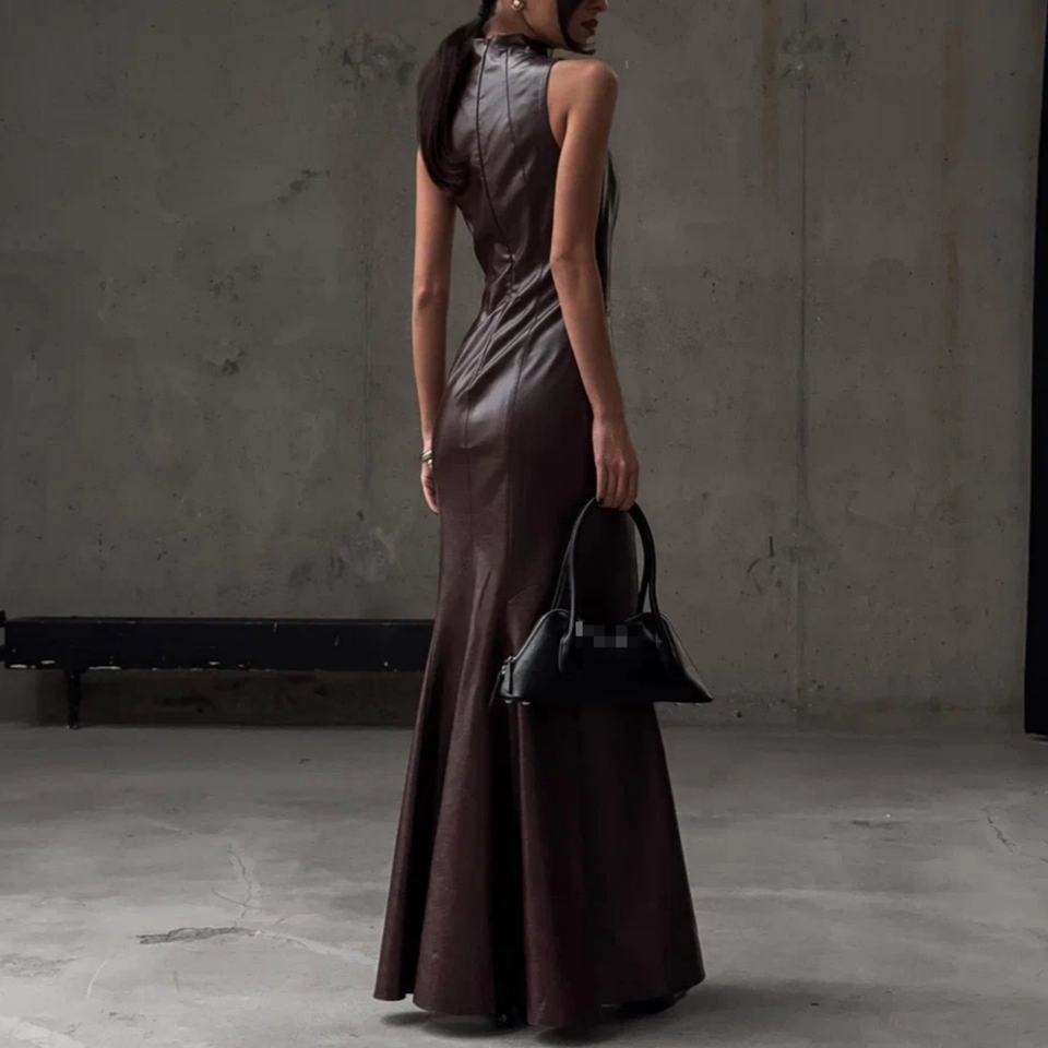ชุดเดรสยาวทรงเข้ารูปหนัง PU แบบสั่งทำสำหรับผู้หญิง แขนกุด เหมาะสำหรับงานปาร์ตี้กลางคืนหรืองานพรอม