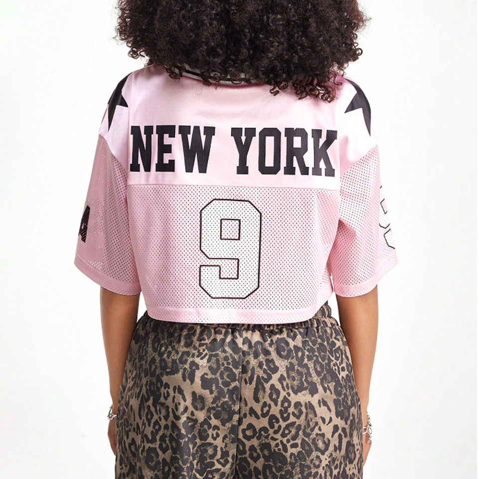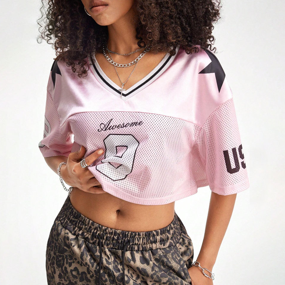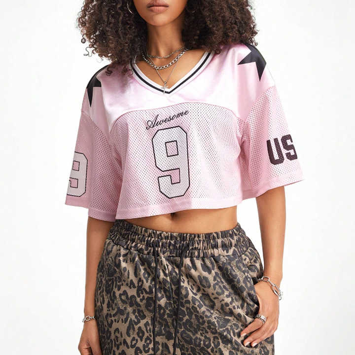 OEM Custom Print American Football Jersey Women Summer Short Sleeve Crop T-shirt Drop Shoulder V Neck Plus Size Heat-Transfer