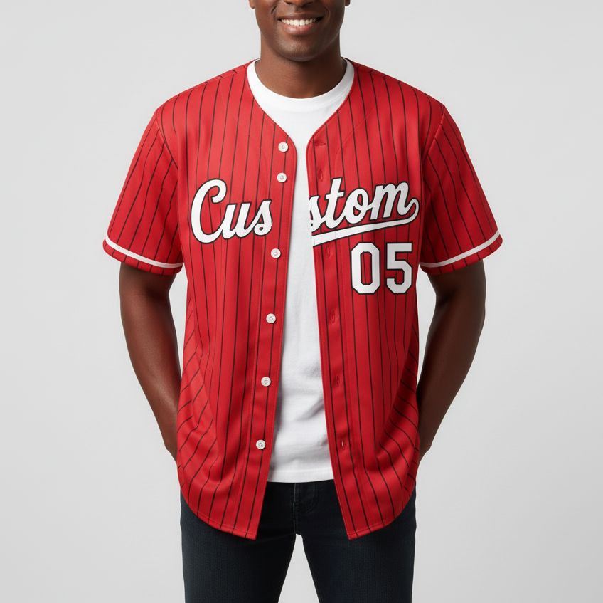 เสื้อเบสบอลแบบสั่งทำพิเศษสำหรับทีมกีฬา ผู้ชาย ลายพิมพ์แบบซับลิเมชั่น ผ้าทวิล คอวี ติดกระดุม ลายทาง โพลีเอสเตอร์ 100% แห้งเร็ว