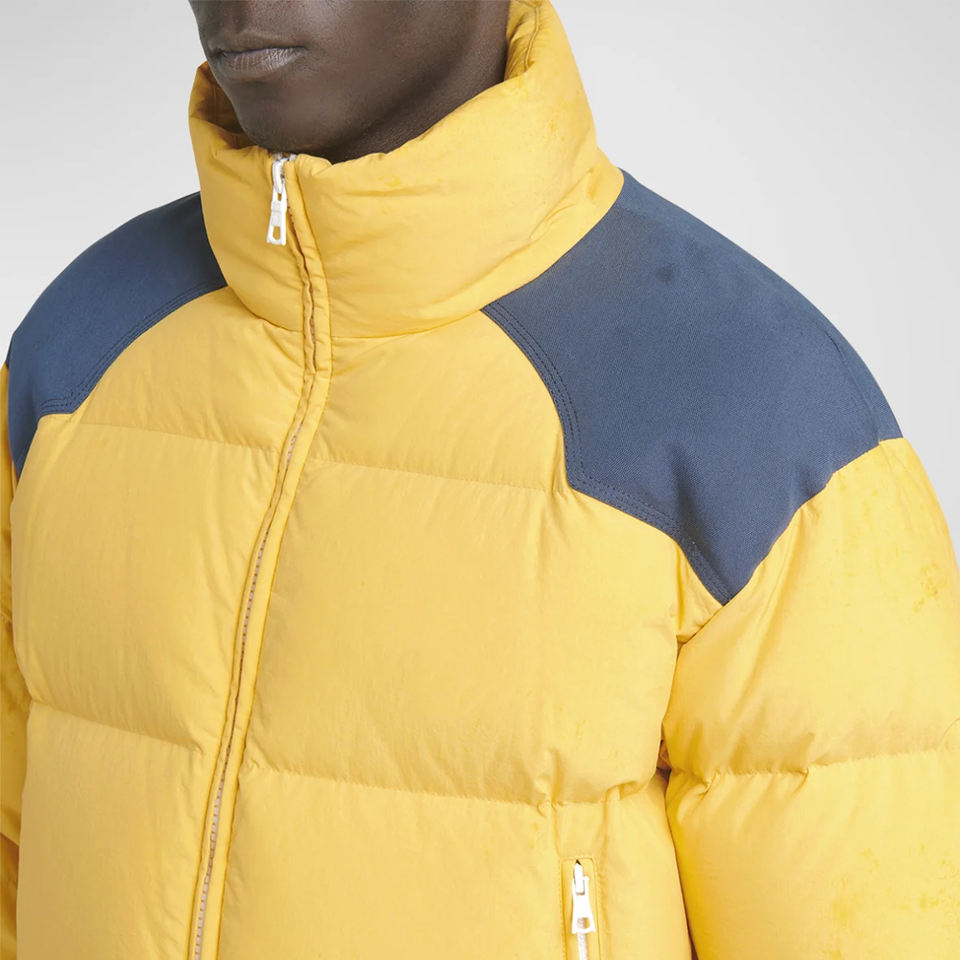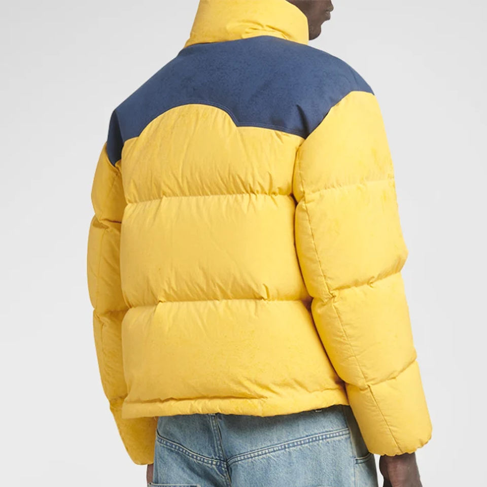 เสื้อโค้ทสำหรับผู้ชายแจ็คเก็ตขนเป็ดสีเหลืองสำหรับฤดูหนาวพิมพ์ลายได้ตามต้องการ