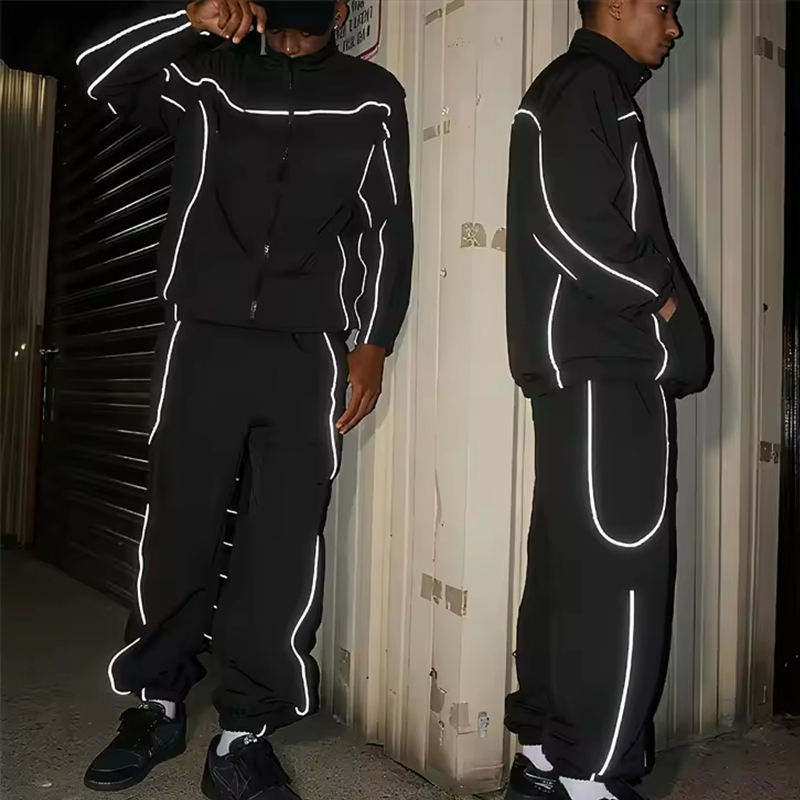ชุดวอร์มผู้ชายแบบมีฮู้ด ผ้าไนลอนกันลมสะท้อนแสง ทรงหลวม น้ำหนักมาก สไตล์วินเทจ สตรีทแวร์ ซิป ยางยืดที่เอว ผลิตตามแบบ OEM