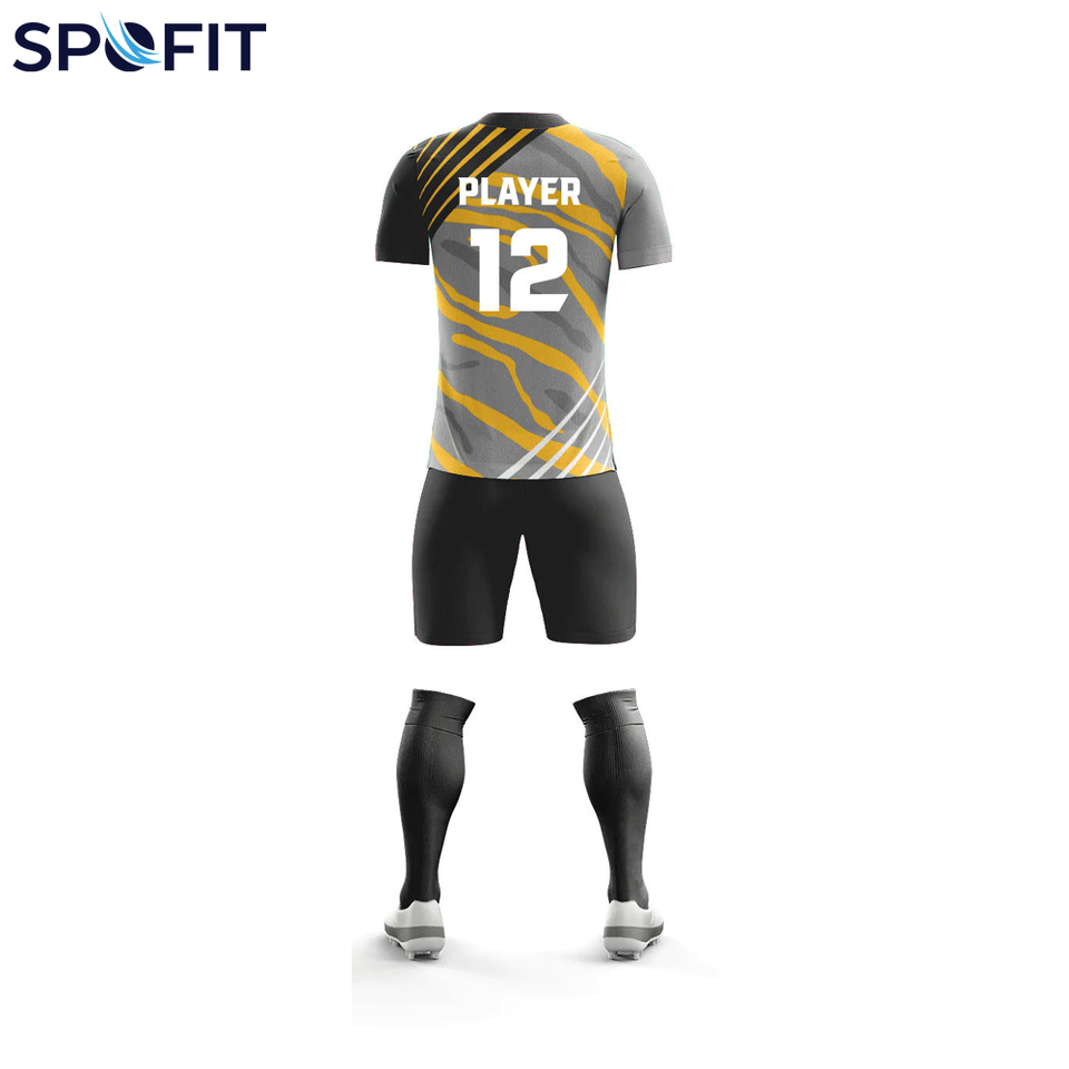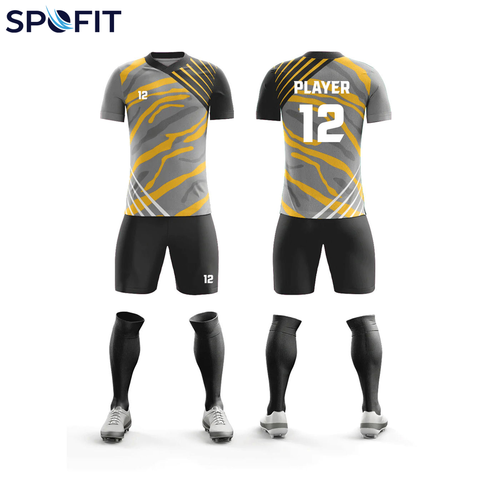 ชุดฟุตบอลแบบกำหนดเองสำหรับ OEM คอวี ดีไซน์แบบซับลิเมชั่น ผ้าโพลีเอสเตอร์แห้งเร็ว ระบายอากาศได้ดีและทนทานสำหรับการเล่นกีฬา