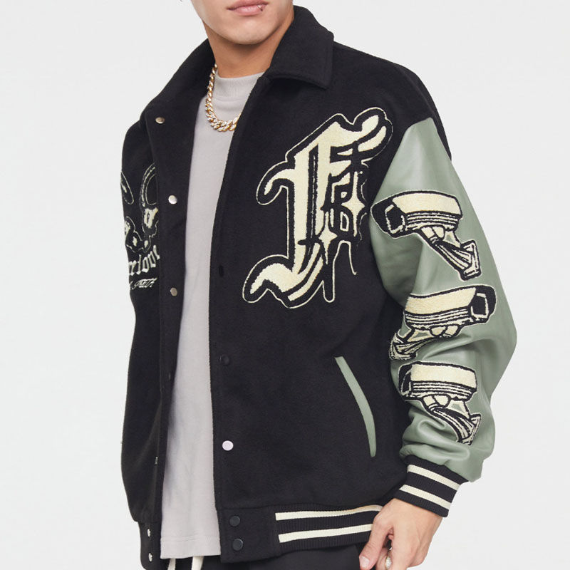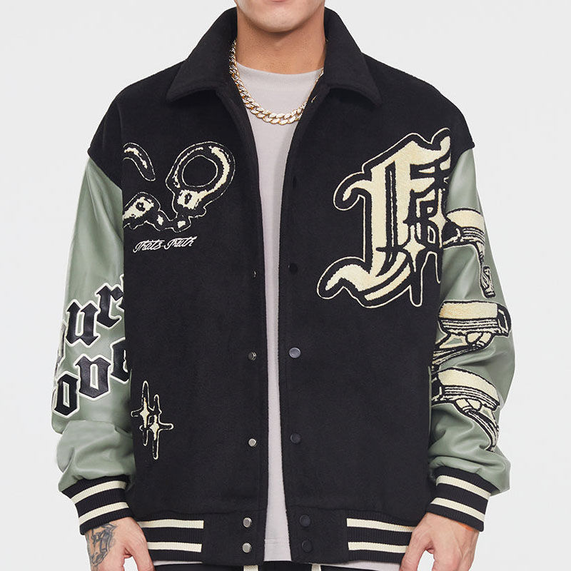 แจ็กเก็ตเบสบอลของผู้ชายแนวสตรีทสำหรับฤดูใบไม้ผลิฤดูใบไม้ร่วงลำลองพร้อมตัวอักษรแบบปะติดดีไซน์ตัดกันสีตามสั่ง