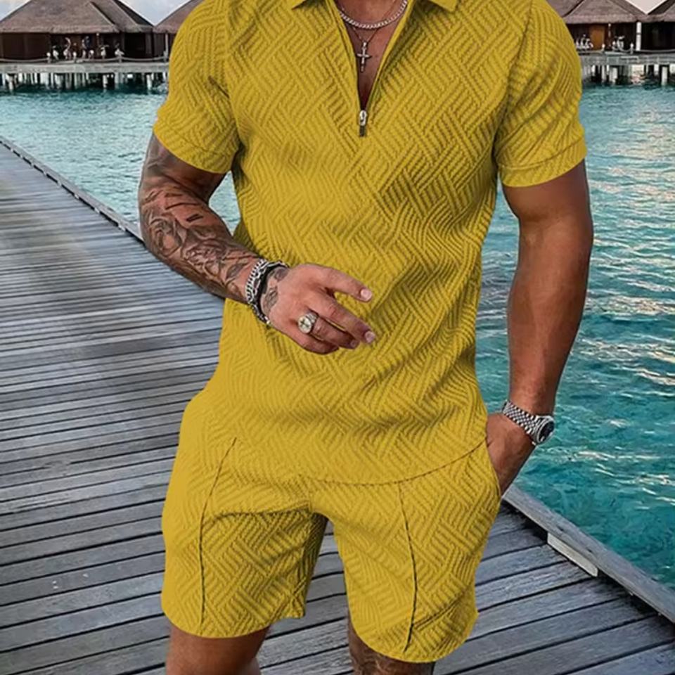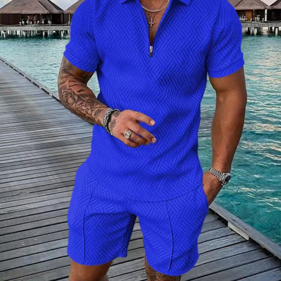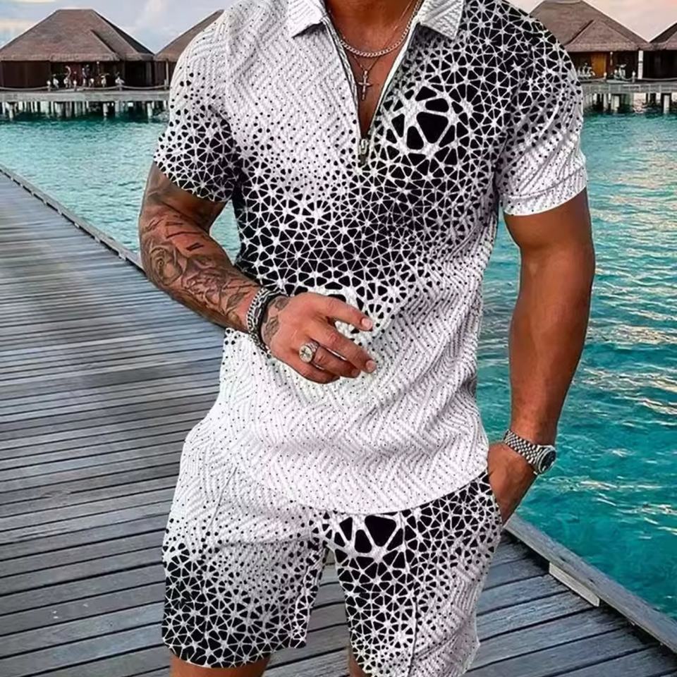 ชุดเซ็ตเสื้อโปโลคอปกซิปพิมพ์ลาย 3 มิติ แฟชั่นฤดูร้อนลำลองแบบ OEM สั่งทำได้ พร้อมกางเกงขาสั้นสองชิ้นสำหรับผู้ชาย