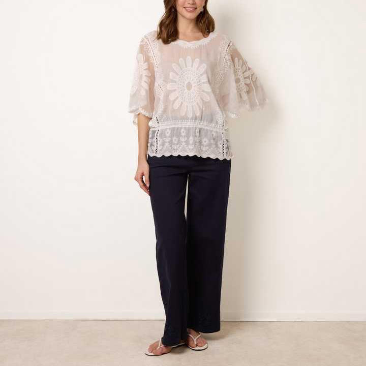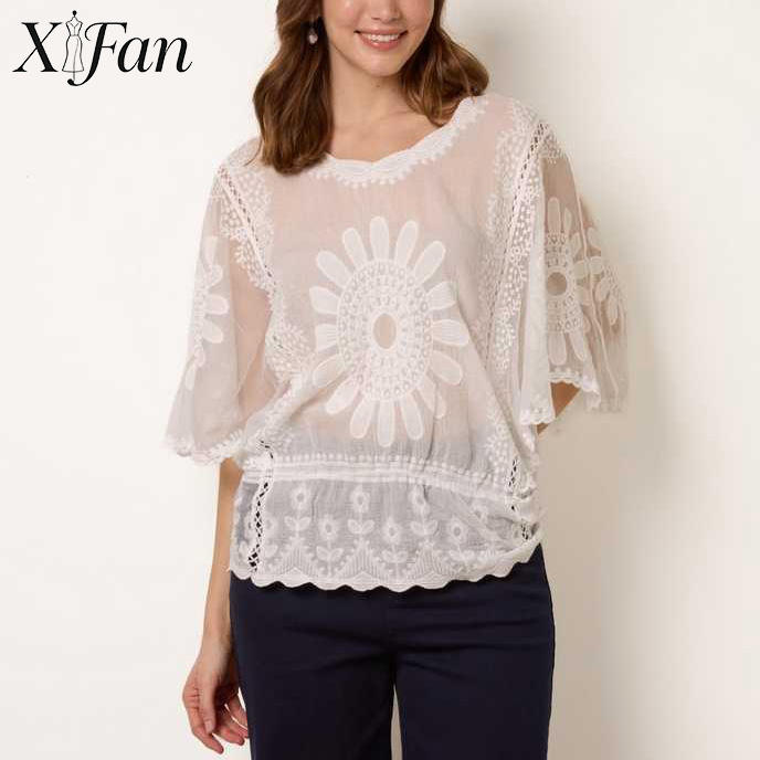 เสื้อผู้หญิงแฟชั่นฤดูร้อนแบบเรียบง่าย สไตล์ OEM ปักลายดอกทานตะวัน แต่งลูกไม้ คอทรงโอ แขนสามส่วน ไหล่ตก