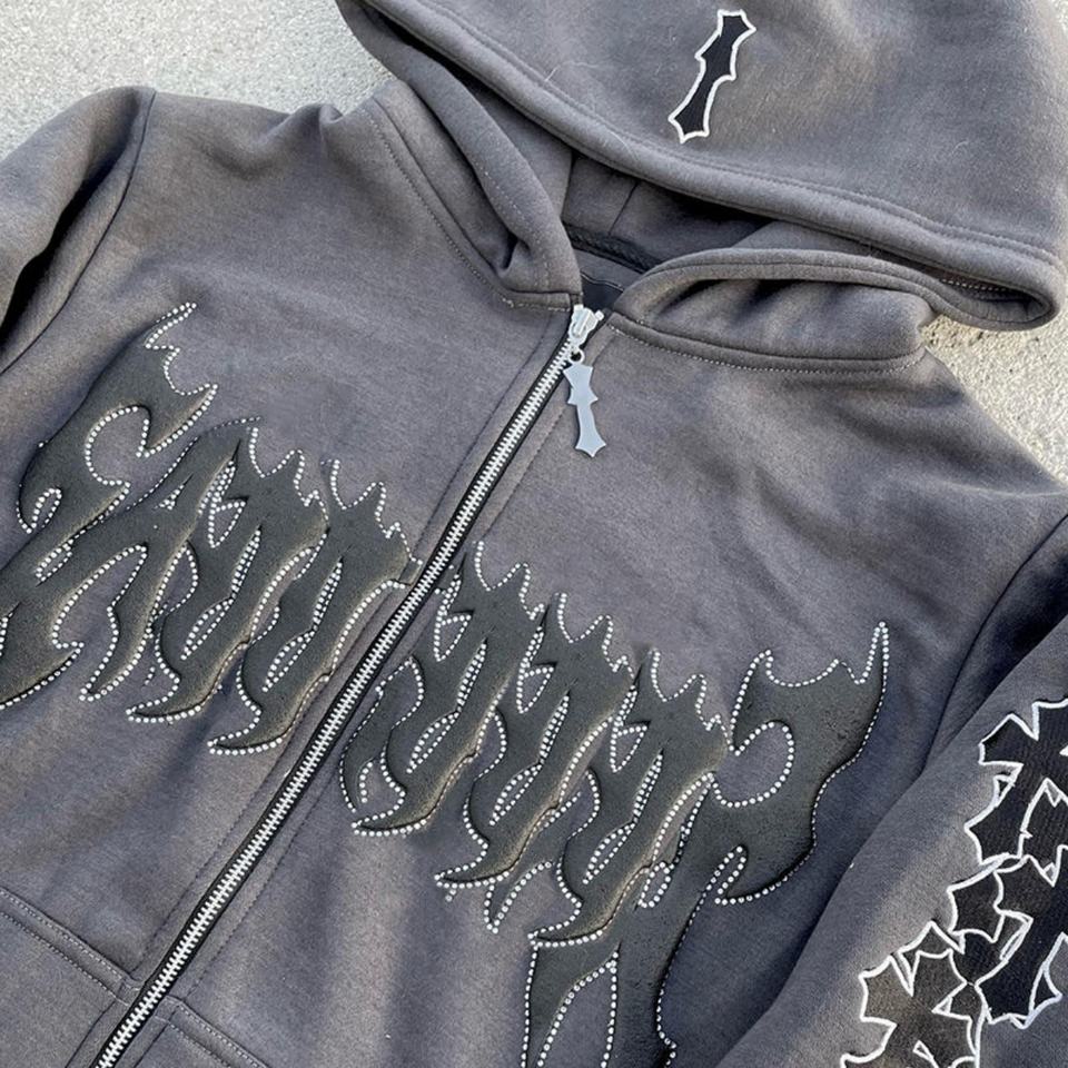 ชุดวอร์มผู้ชายแบบสองชิ้น ฮู้ดดี้ซิปพิมพ์ลายวินเทจไซส์ใหญ่แบบสั่งทำพิเศษ พร้อมกางเกงขาสั้น ประดับด้วยคริสตัลและงานปัก