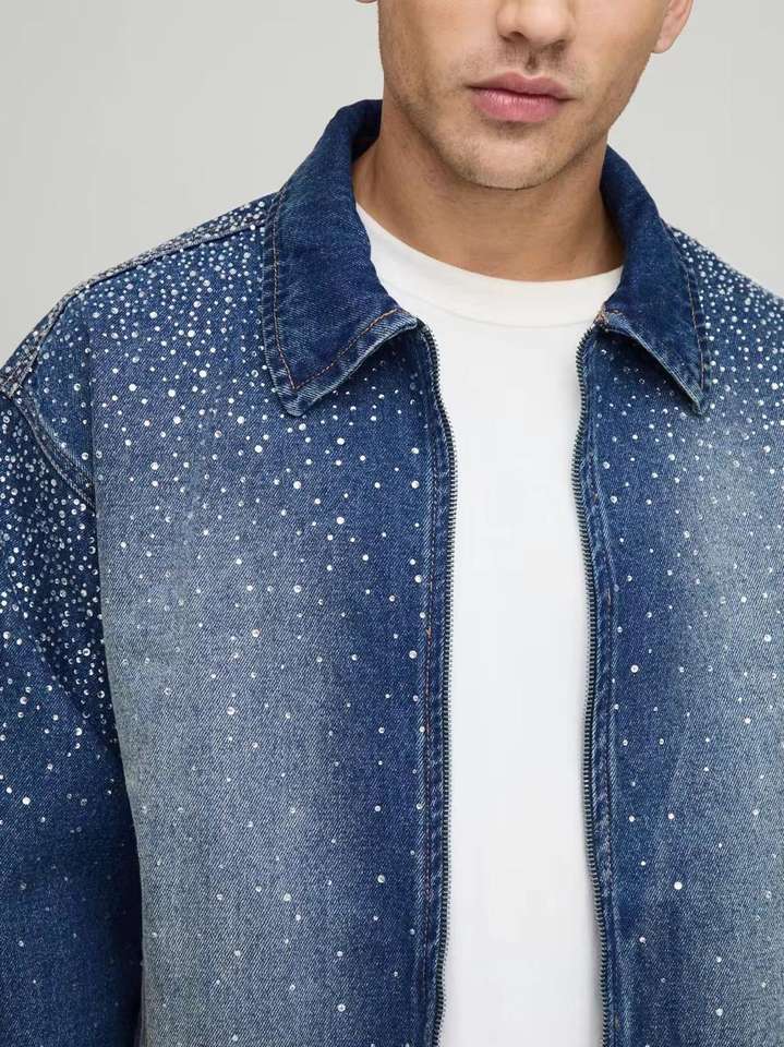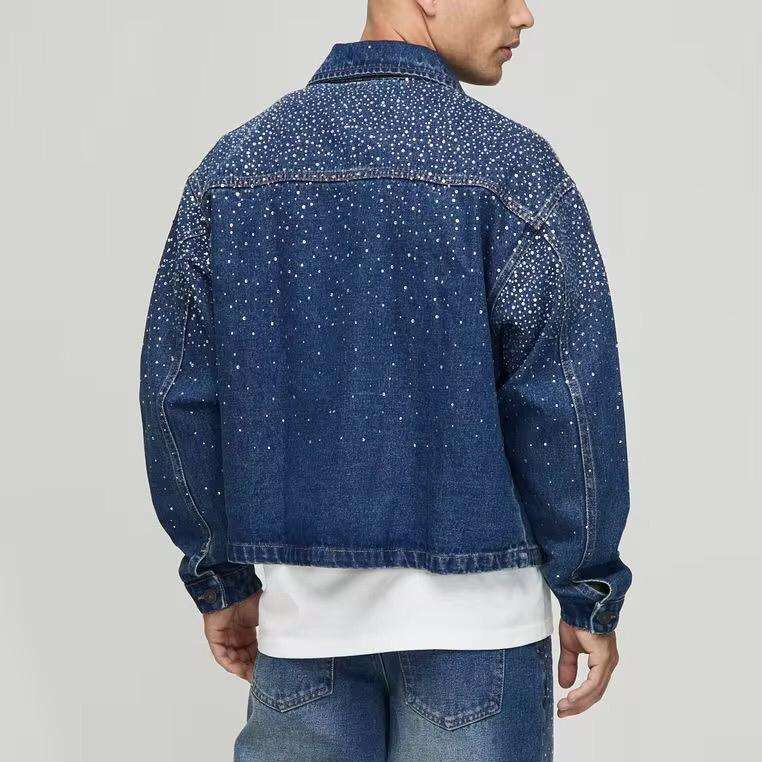 แจ็คเก็ตยีนส์เดนิมสไตล์วินเทจลำลองสำหรับฤดูหนาวแบบ OEM สำหรับผู้ชาย แต่งลายปักลายเสือดาว ประดับด้วยคริสตัล กันลม สไตล์สตรีทแวร์สีซีดจาง