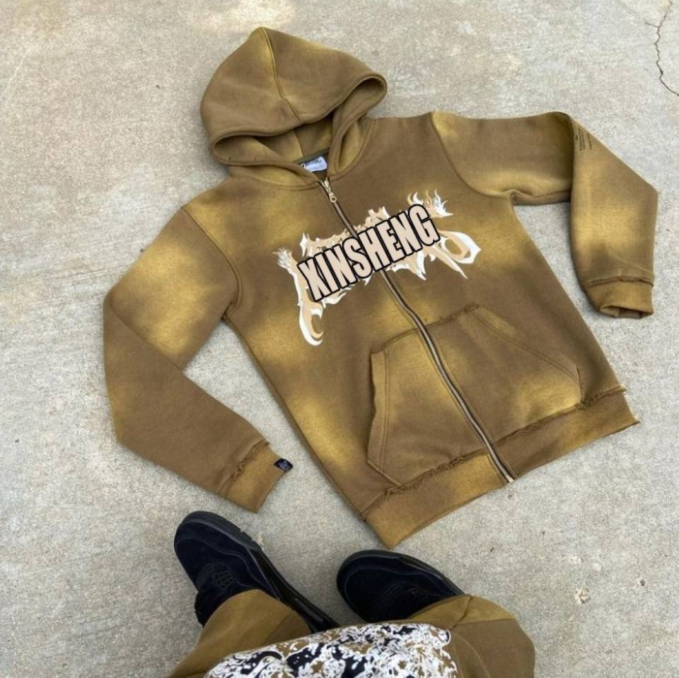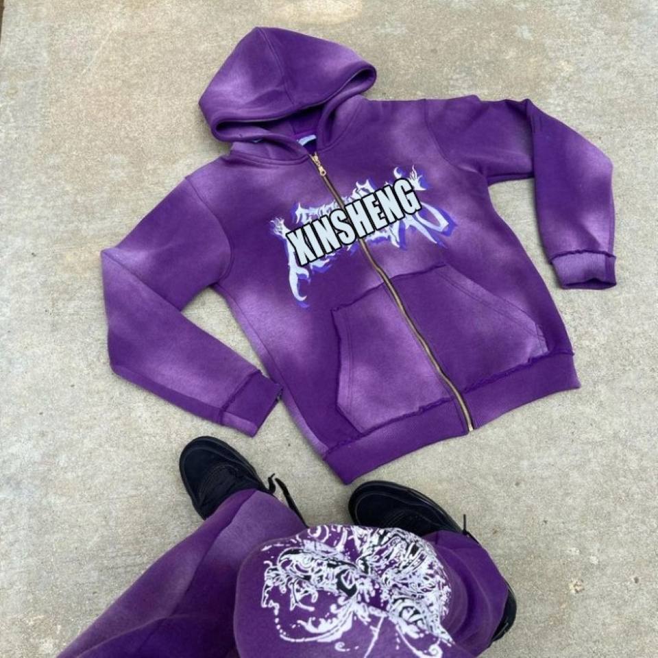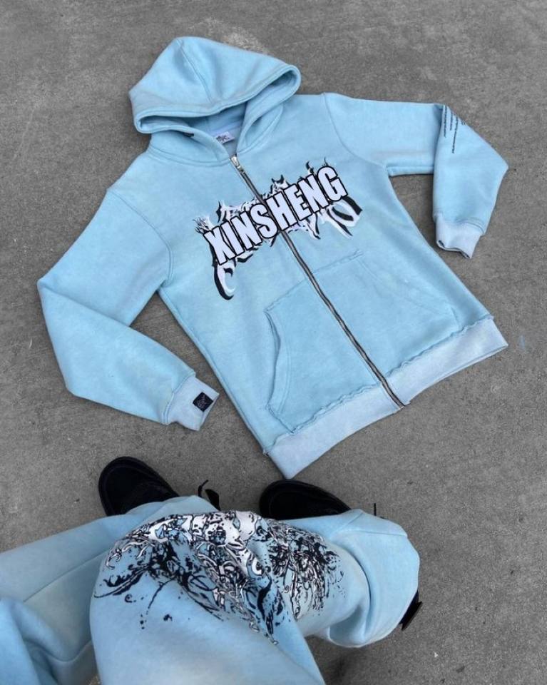 ชุดเซ็ตเสื้อฮู้ดซิปและกางเกงจ็อกเกอร์ทรงบาน ผ้าคอตตอนหนานุ่ม ล้างสีแบบแอซิดวอช สไตล์สตรีทแวร์ พิมพ์ลายฤดูหนาว ผลิตตามแบบ OEM สำหรับทุกเพศ