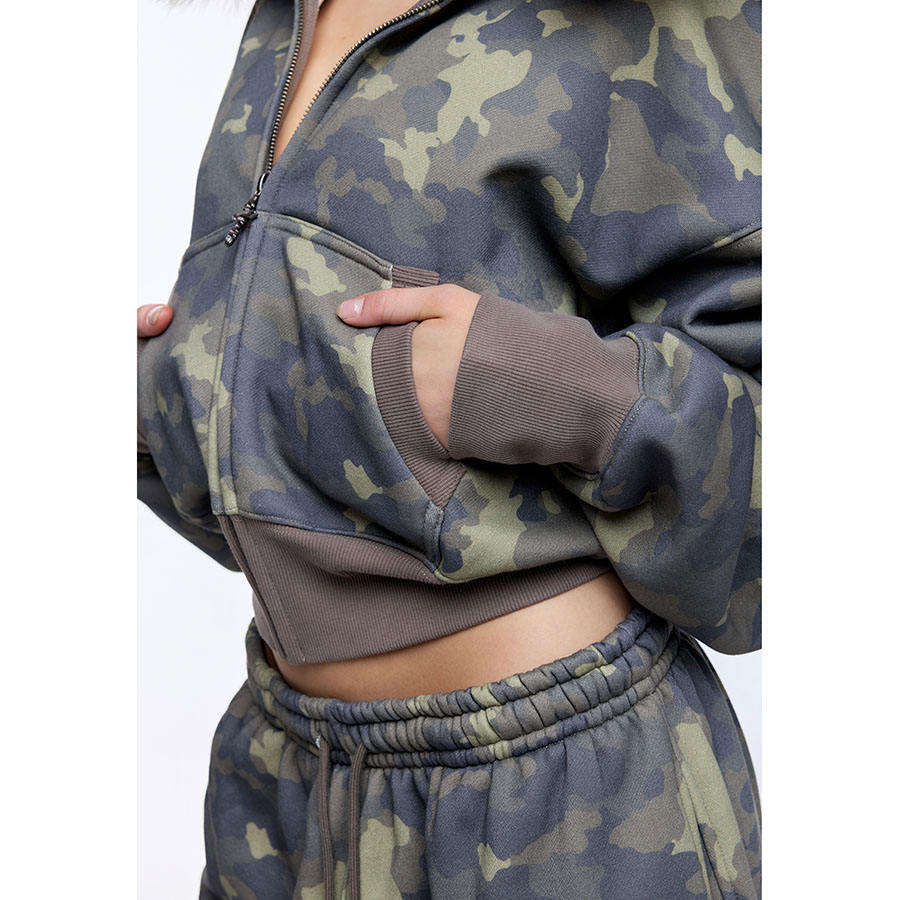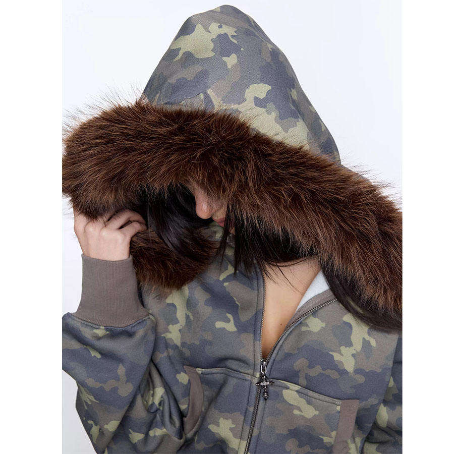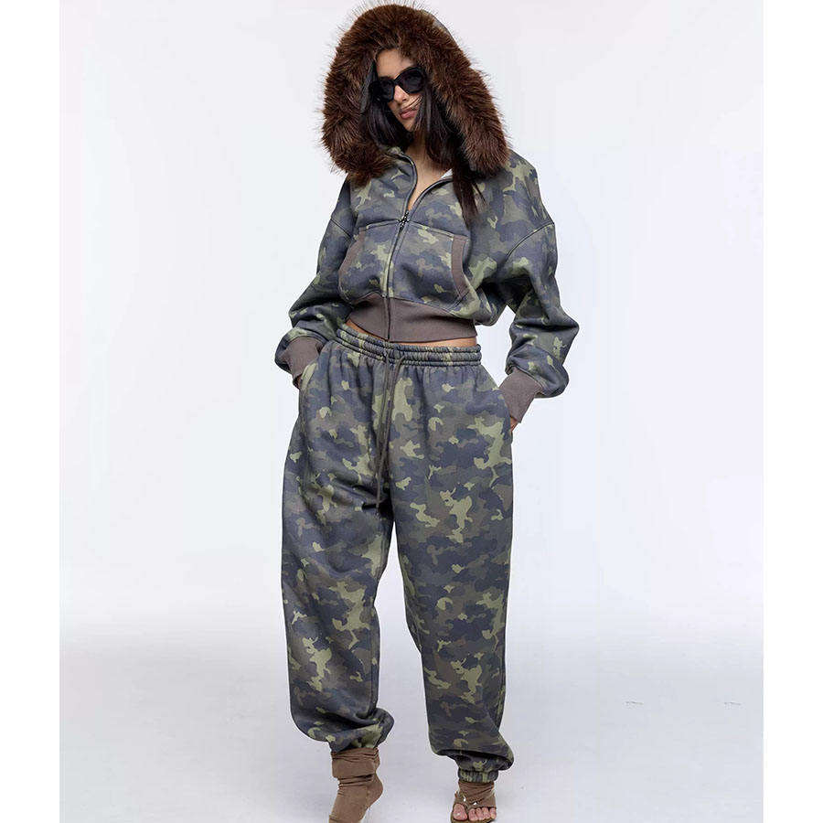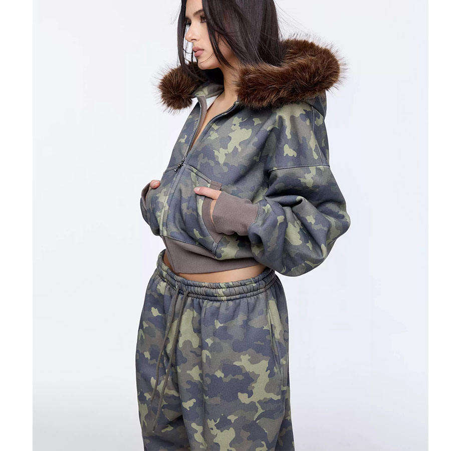 ชุดวอร์มครอปแบบสั่งทำสำหรับผู้หญิง ผ้าเนื้อเดียว ฮู้ดขนฟ็อกซ์ กางเกงกันน้ำ เป็นมิตรกับสิ่งแวดล้อม
