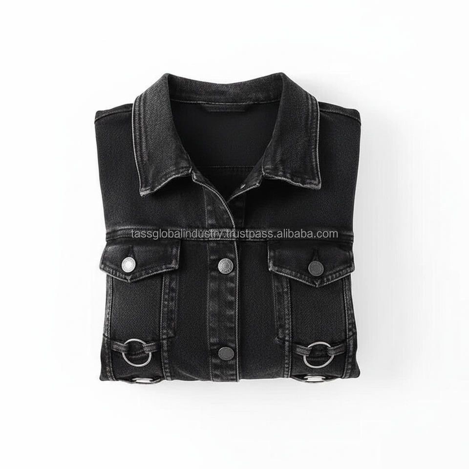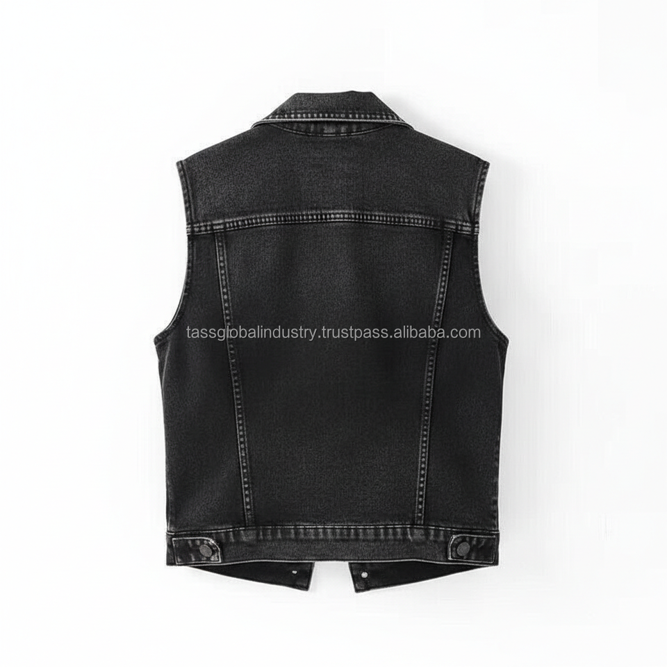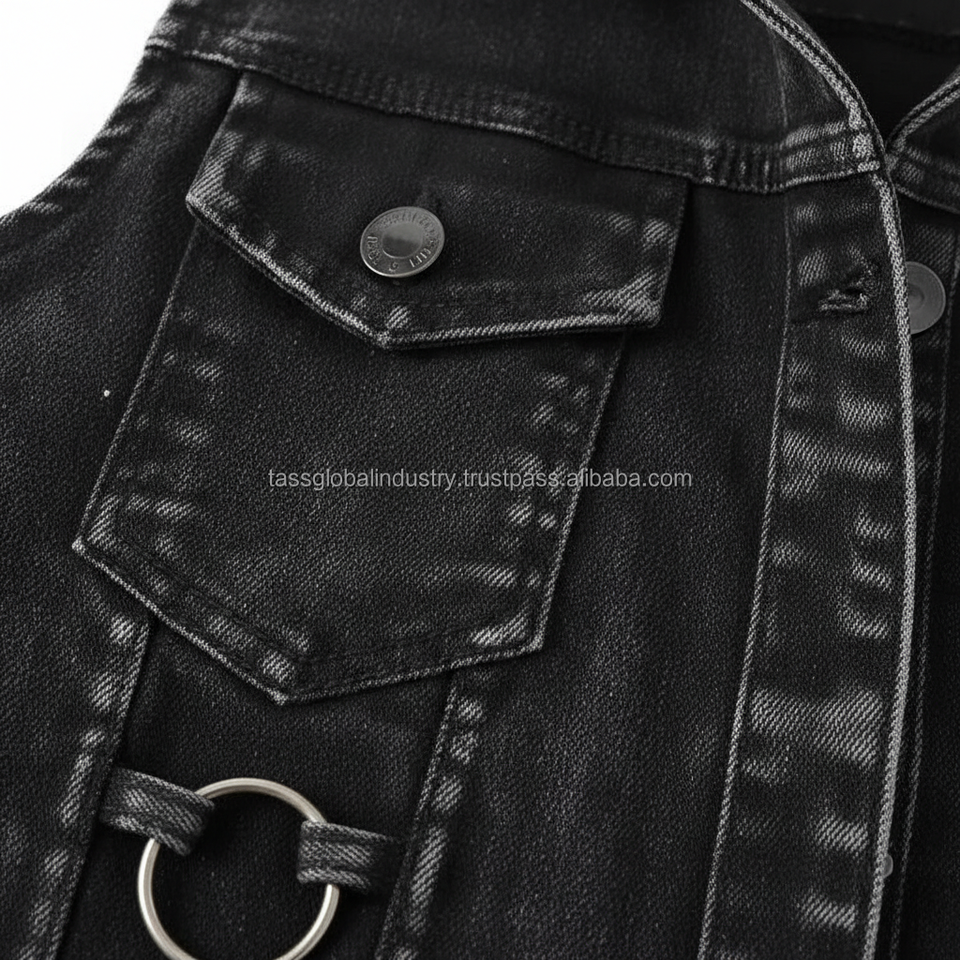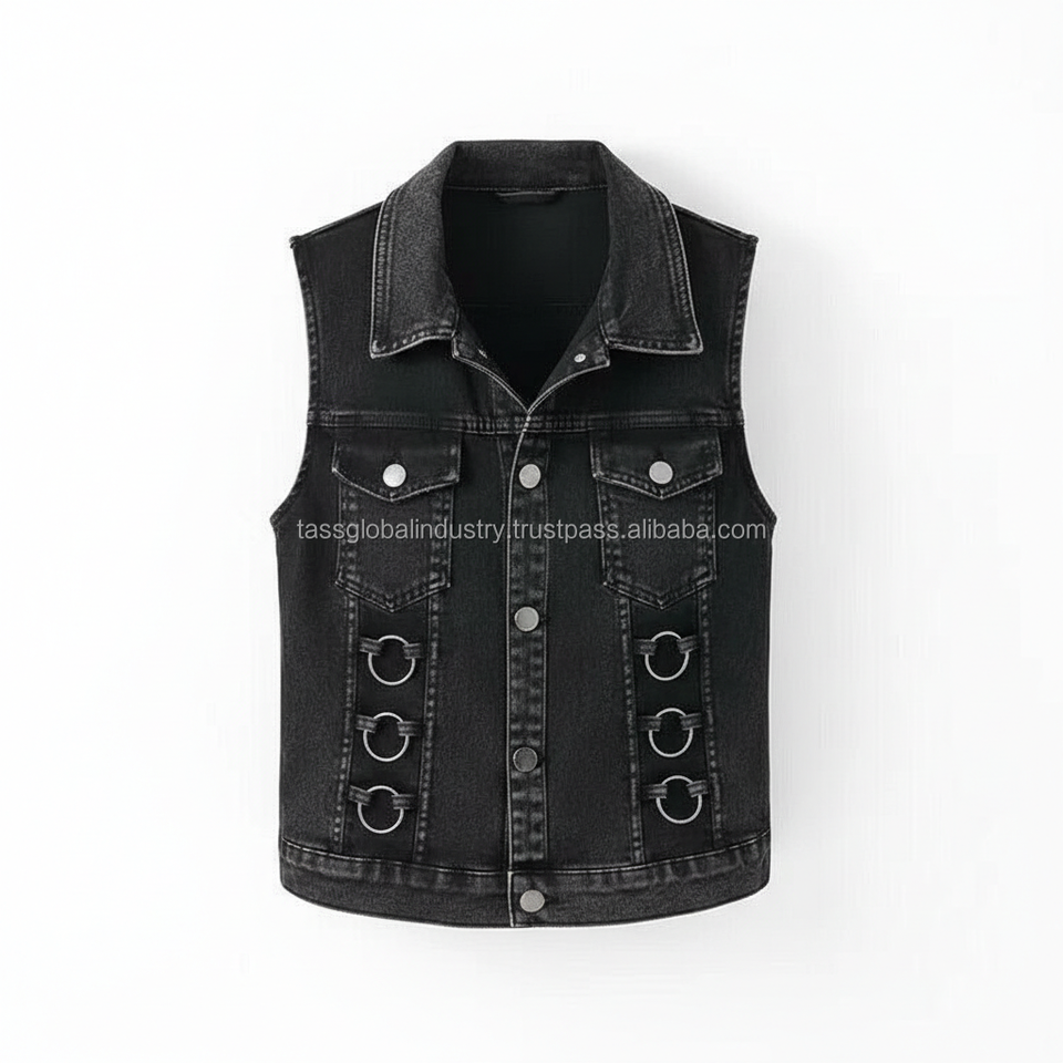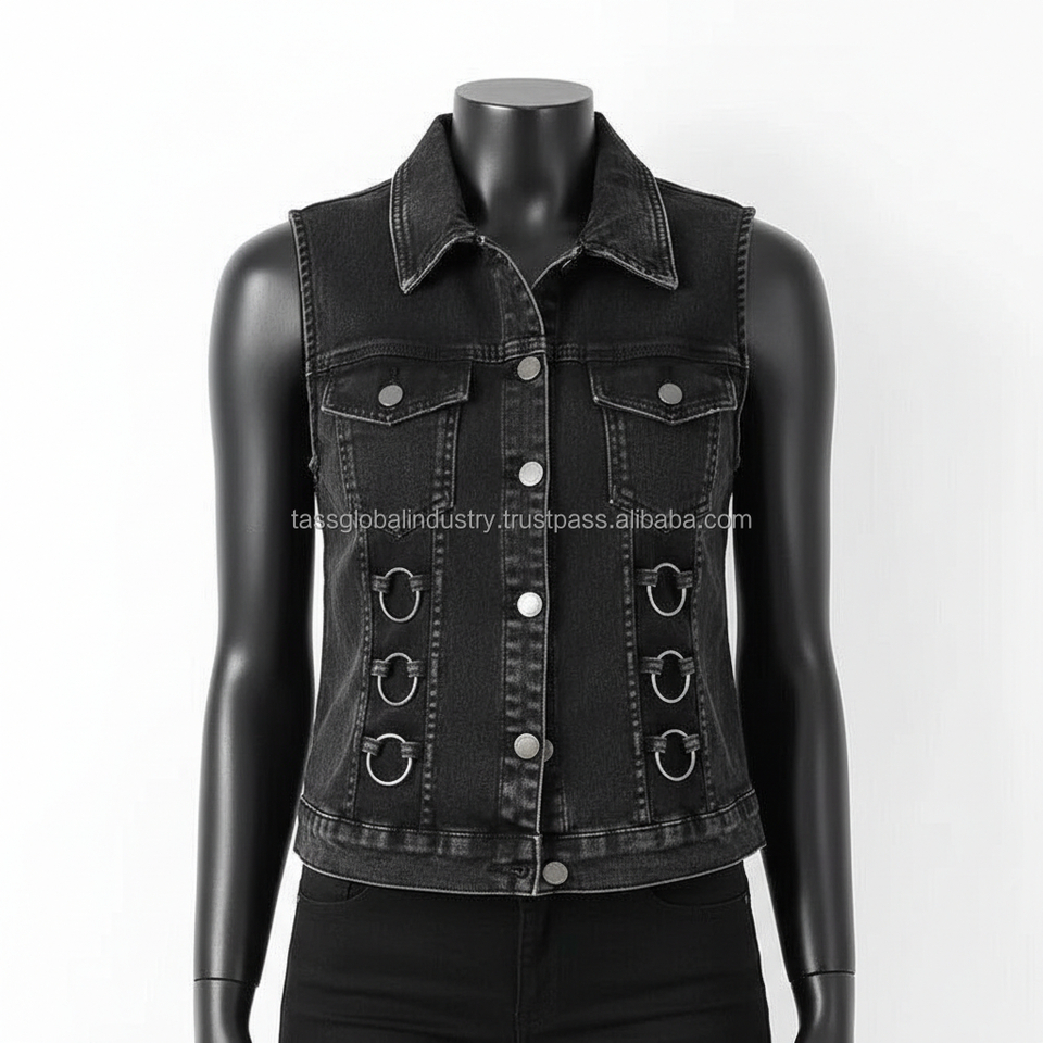 เสื้อกั๊กยีนส์สีดำสไตล์โกธิคสำหรับผู้หญิงแบบ OEM สั่งทำพิเศษ ไม่มีแขน แต่งห่วงโลหะ สตรีทแวร์ ทรงเข้ารูป สั้นแบบครอป