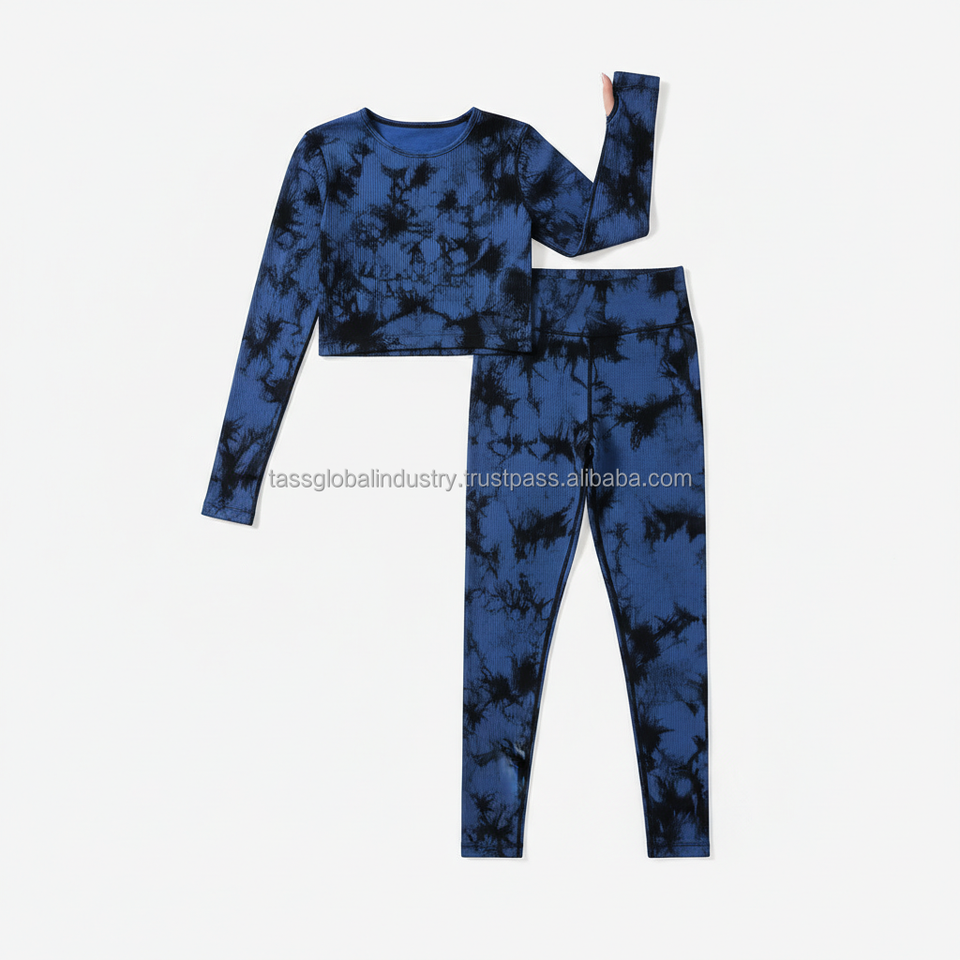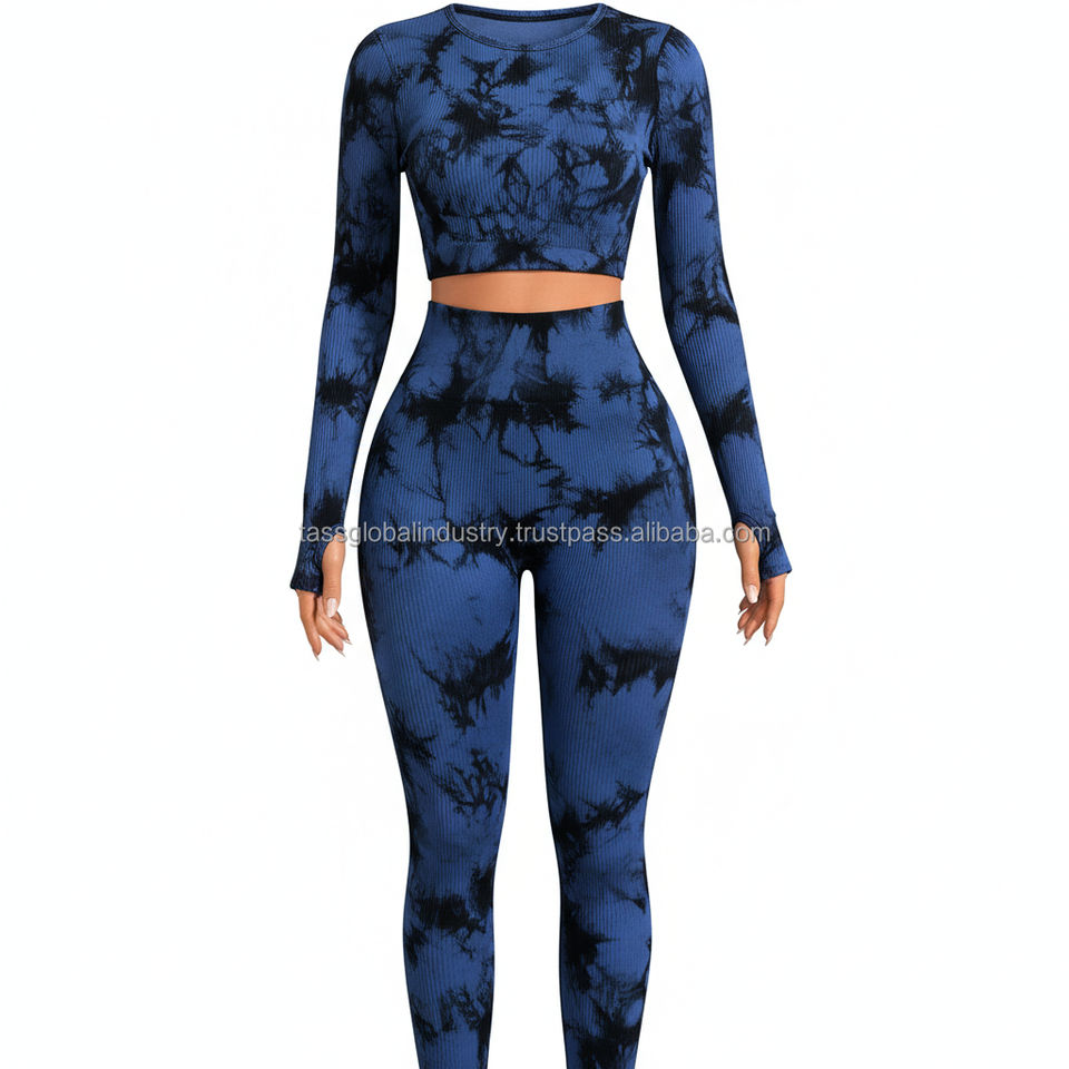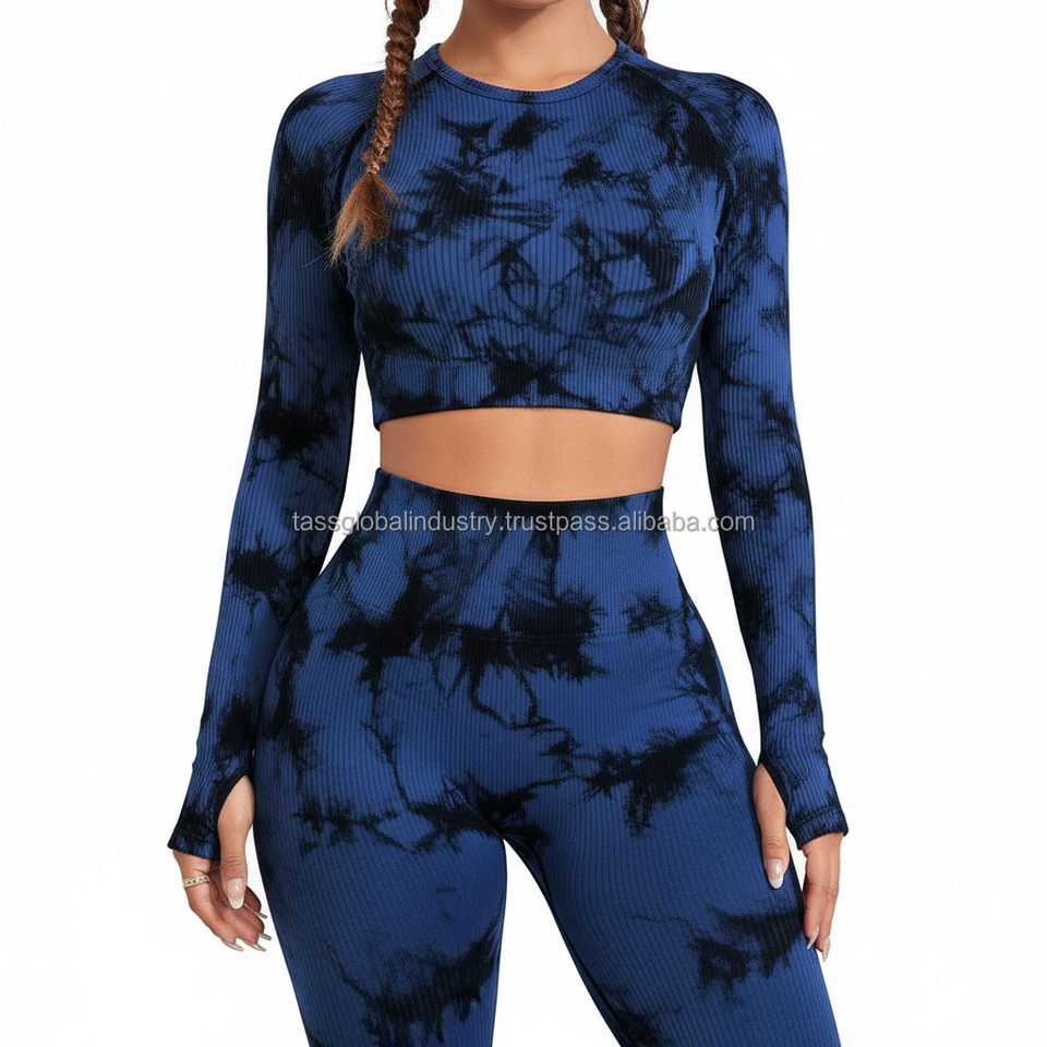 ชุดโยคะผู้หญิงแบบสั่งทำ OEM ลายย้อมสีแบบริบ ท็อปครอปแขนยาวมีรูสำหรับนิ้วโป้ง และเลกกิ้งเอวสูง ชุดออกกำลังกาย 2 ชิ้น