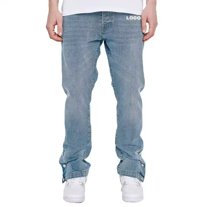 กางเกงยีนส์ผู้ชายสีน้ำเงินแบบสกินนี่ติดกระดุมด้านข้าง รับผลิตตามแบบ OEM พร้อมโลโก้ กางเกงยีนส์ทรงแบ็กกี้คุณภาพสูงสำหรับผู้ชาย ผลิตโดยผู้ผลิตกางเกงยีนส์เดนิมแบบสแต็ค