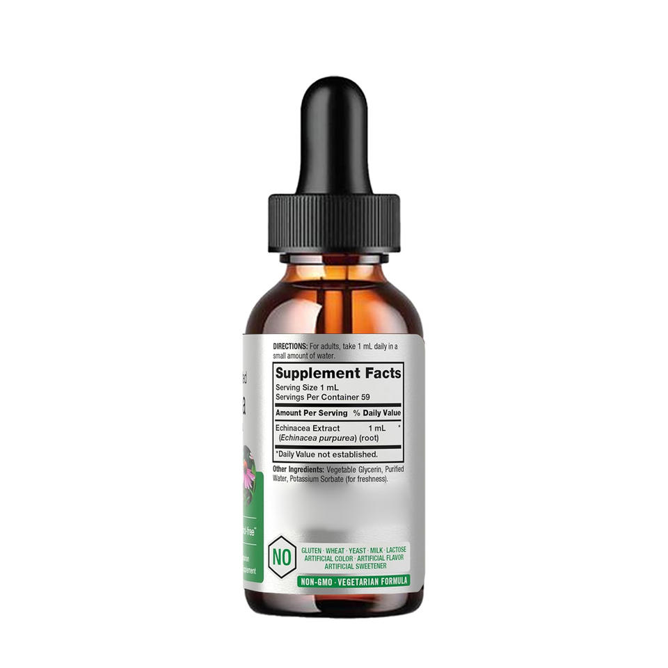 สารสกัดอีไคนาเซียเข้มข้นแบบน้ำ ปรับแต่งได้ตามความต้องการของผู้ผลิต (OEM) ปราศจากแอลกอฮอล์ ปราศจากกลูเตน และสูตรไม่ใช่จีเอ็มโอ ขนาด 2 ออนซ์