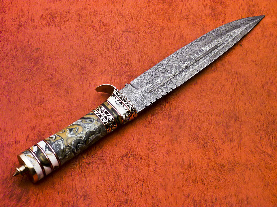 ปลอกมีดโบวีเหล็กดามัสกัสปรับแต่งได้ทำด้วยมือพร้อมที่จับสีเทอร์ควอยซ์ทำจากเรซิ่นและปลอกหนังแบบบิดสำหรับ EDC