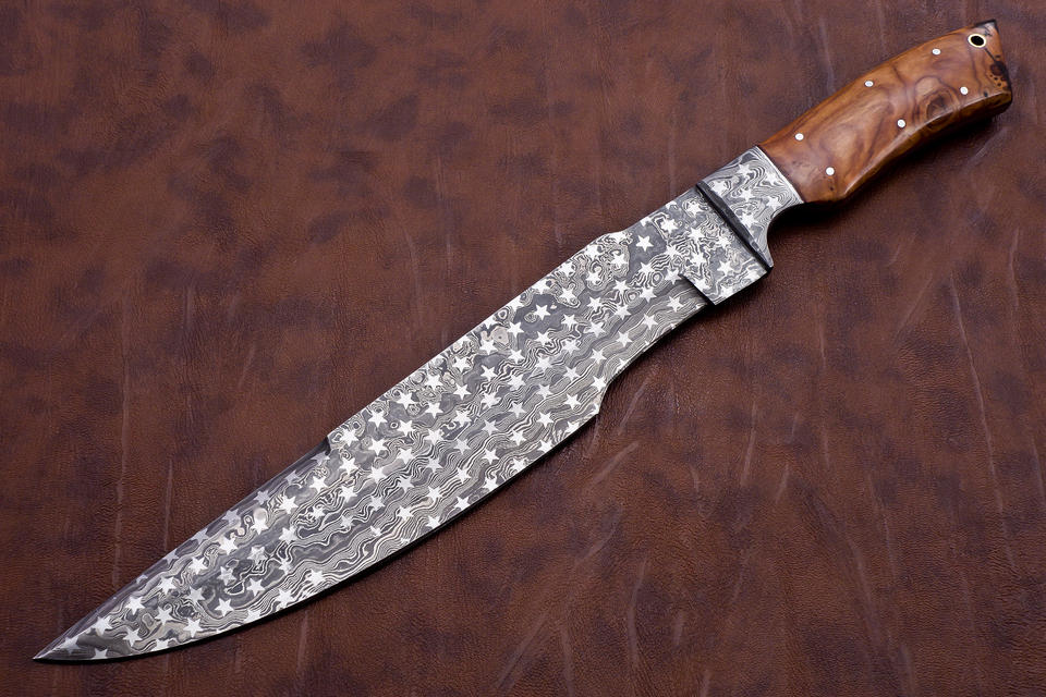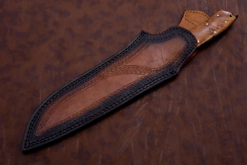 มีดล่าสัตว์เหล็กดามัสกัสแบบกำหนดเองได้จากโรงงานผู้ผลิต (OEM) ด้ามไม้พะยูงทำมือ ลายบิดเกลียว พร้อมปลอกหนังสำหรับพกพา (EDC)