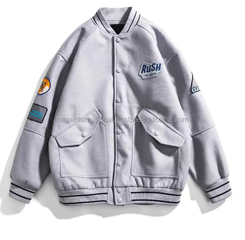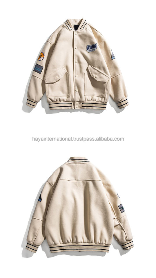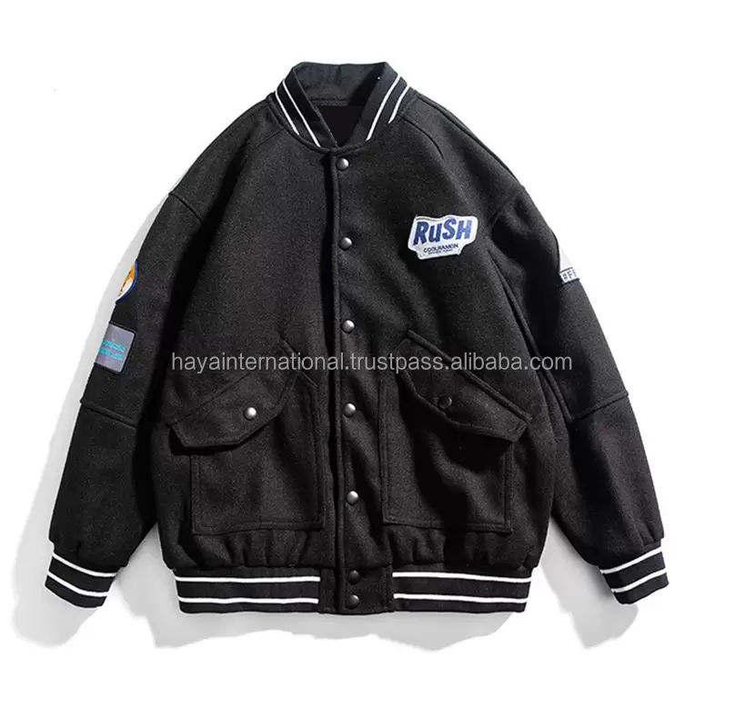 OEM ที่กำหนดเองเย็บปักถักร้อย Ptaches ฤดูหนาว100% ผ้าฝ้ายขนแกะมหาวิทยาลัยผู้ชายแจ็คเก็ตตัวแทน