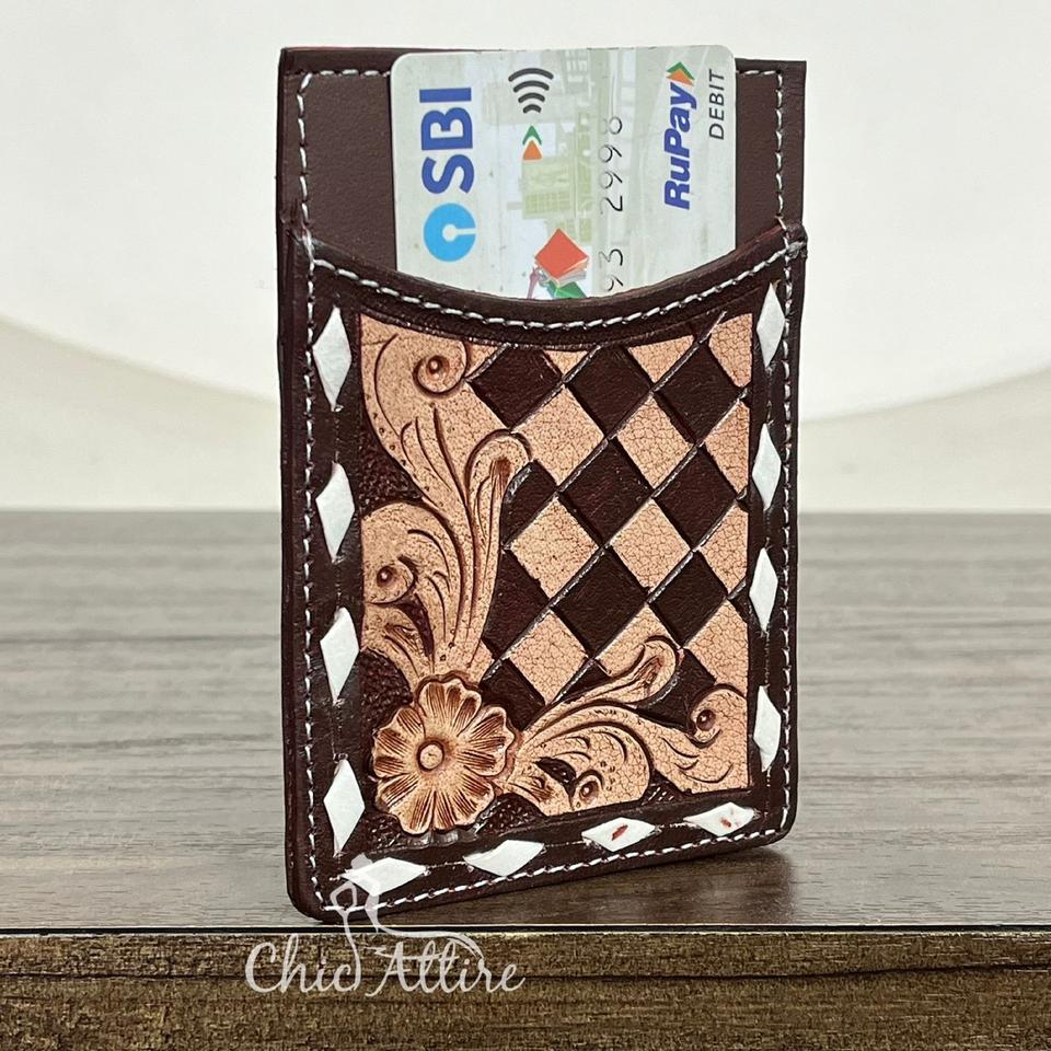 Hand Tooled Checkered Leather Credit Card Holder Wallet
