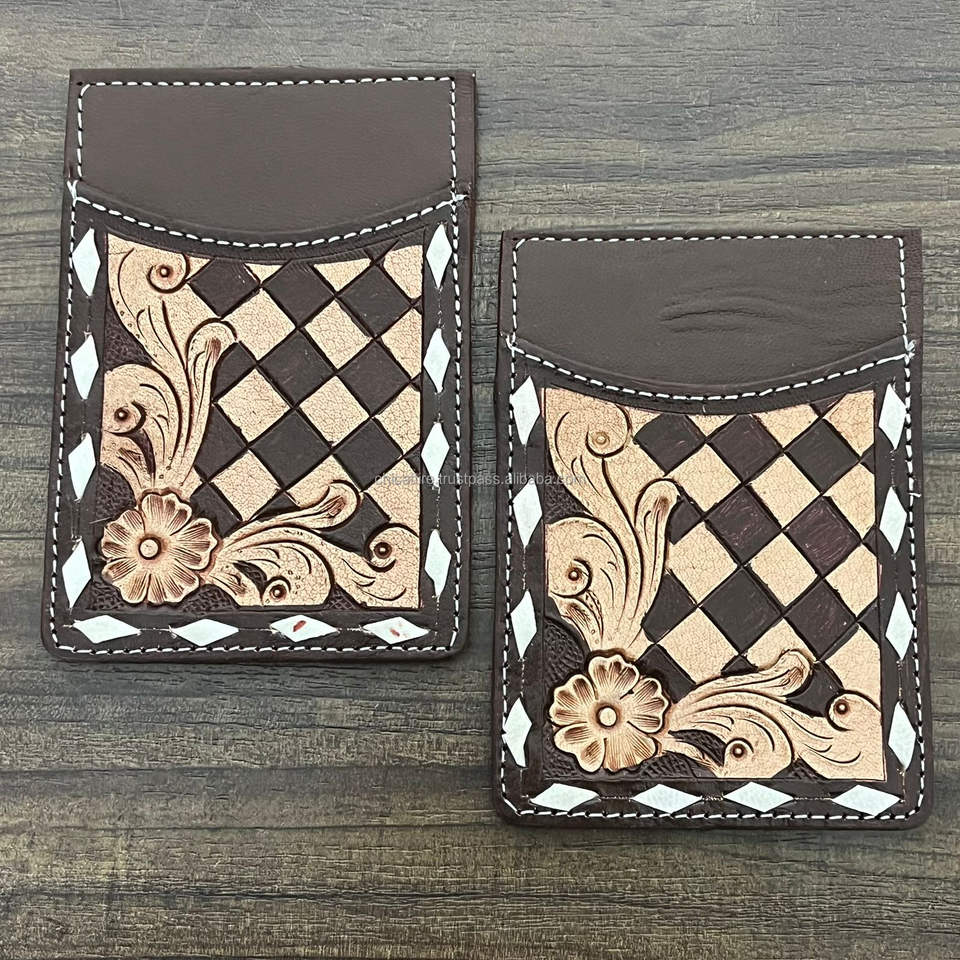 Product name:Hand Tooled Checkered Leather Credit Card Holder Wallet