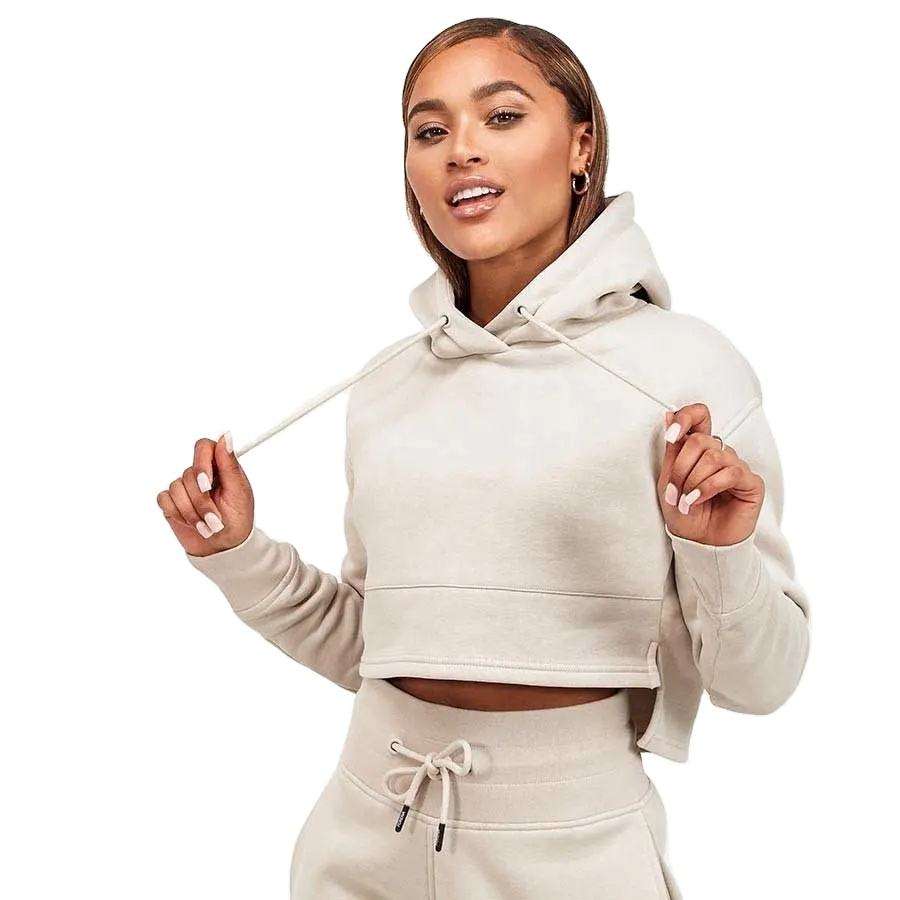 เสื้อครอปมีฮู้ดผ้าด๊บบบี้มีฮู้ดผ้าคอตตอนน้ำหนักมากสำหรับผู้หญิงด้านหน้าพิมพ์โลโก้ตามสั่ง