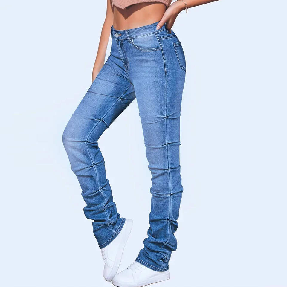 กางเกงยีนส์เอวสูงแฟชั่นสำหรับผู้หญิง ไซส์พลัส ระบายอากาศได้ดี สวมใส่สบาย ทรงเข้ารูป รับผลิตแบบ OEM พร้อมสกรีนโลโก้