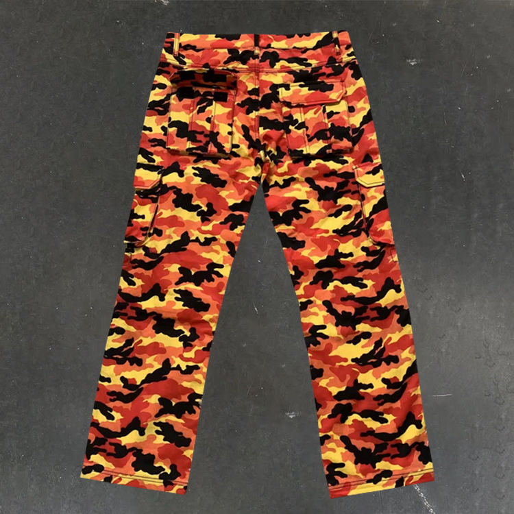 กางเกงคาร์โก้ลายพรางสีส้มพิมพ์ลายกราฟิกผ้าฝ้ายหนานุ่มสำหรับผู้ชาย สไตล์สตรีทแวร์แบบ OEM สั่งทำได้