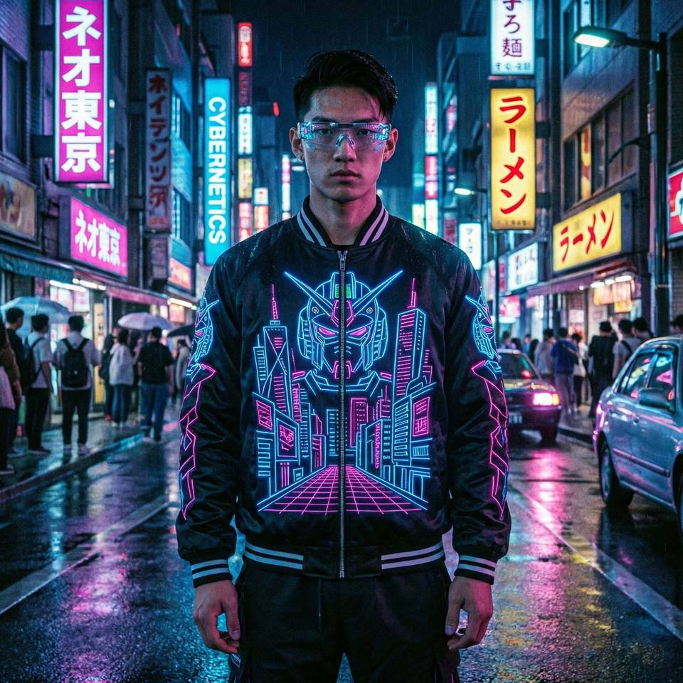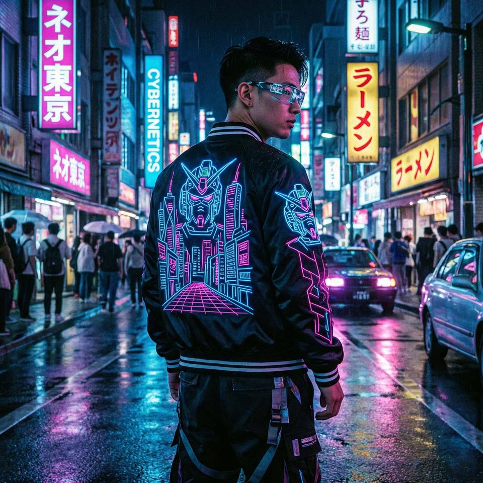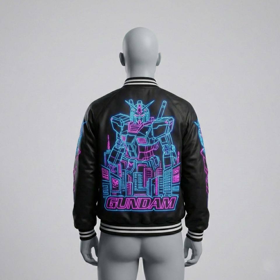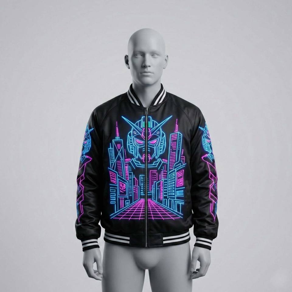 ผู้ผลิตแจ็คเก็ต OEM Cyberpunk Streetwear Satin Sukajan ลายปักหุ่นยนต์อนิเมะญี่ปุ่นสไตล์นีออน แจ็คเก็ตบอมเบอร์สำหรับผู้ชาย ของที่ระลึก
