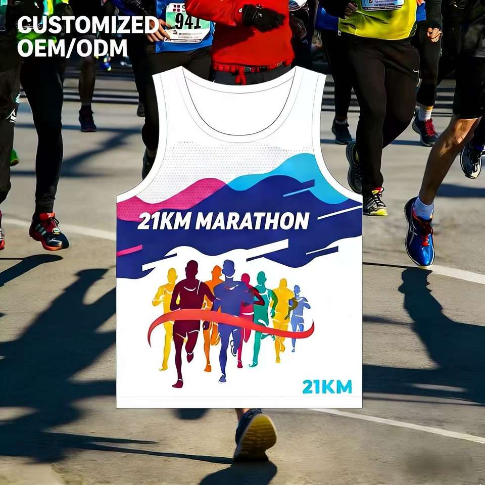 เสื้อกล้ามวิ่งมาราธอนแบบแห้งเร็ว พิมพ์ลายเต็มตัว สำหรับกิจกรรมสนุกๆ สีสันสดใส รุ่น OEM DOM Sublimation