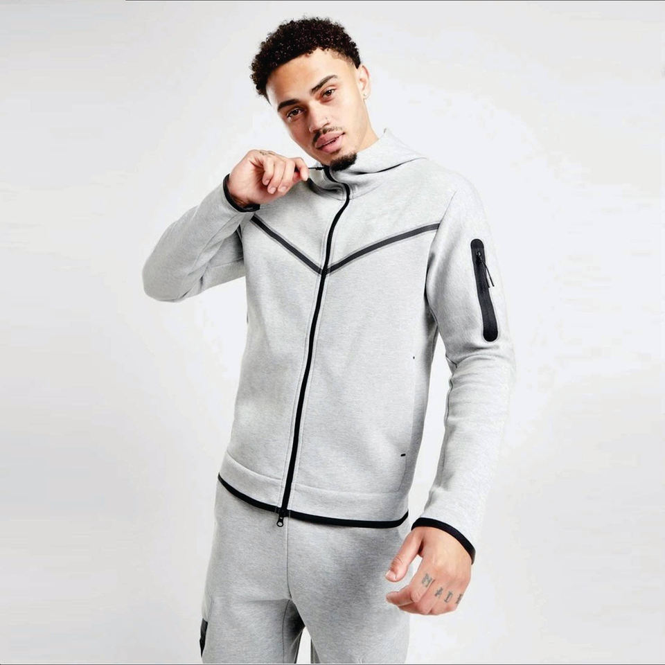 ชุดวอร์มเทคฟลีซผู้ชาย สีเทาเฮเธอร์ ดีไซน์ OEM ผ้าฝ้าย 69% โพลีเอสเตอร์ 31% เสื้อฮู้ดซิปเต็มตัว กางเกงจ็อกเกอร์ขายาว