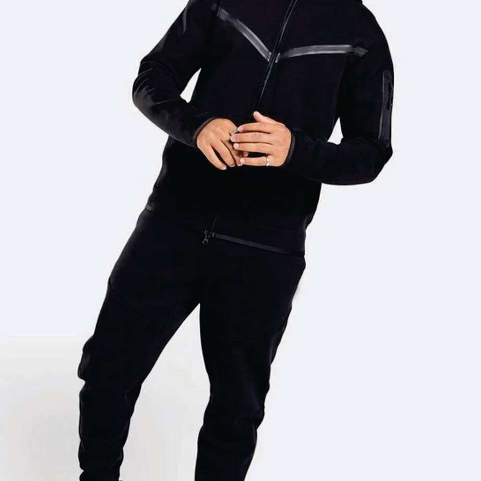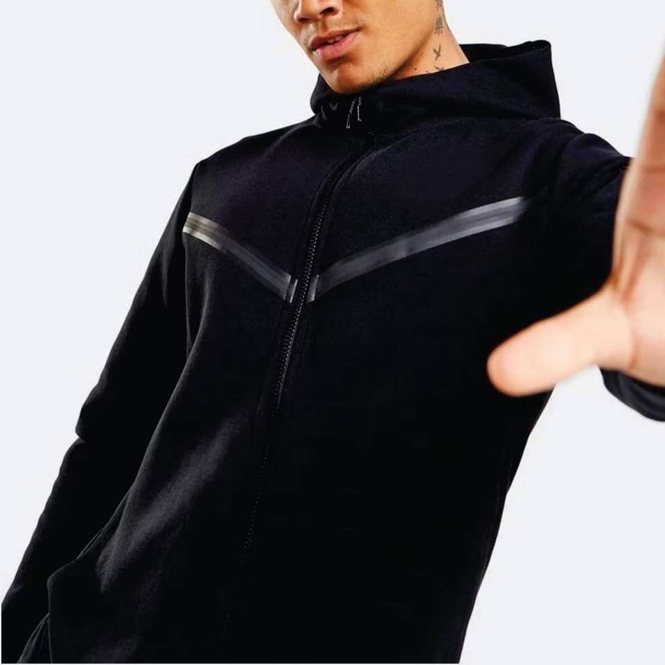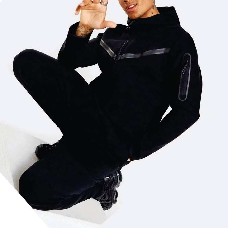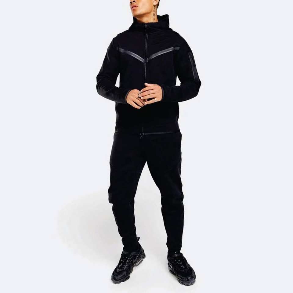 ชุดวอร์มเทคฟลีซพิมพ์ลายสำหรับผู้ชาย สีดำ ผ้าฝ้าย 69% โพลีเอสเตอร์ 31% แบบซิปเต็มตัว พร้อมกางเกงจ็อกเกอร์ ดีไซน์ OEM สำหรับฤดูหนาว