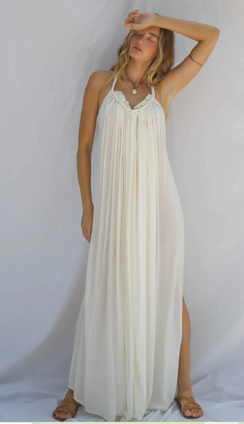 ชุดเดรสเสื้อโบโฮทรงหลวมของผู้หญิงชุดเดรสสีล้วนผ้าลินินและผ้าฝ้ายหลังเซ็กซี่น้อยลงสำหรับใส่ไปพักผ่อนที่พื้น