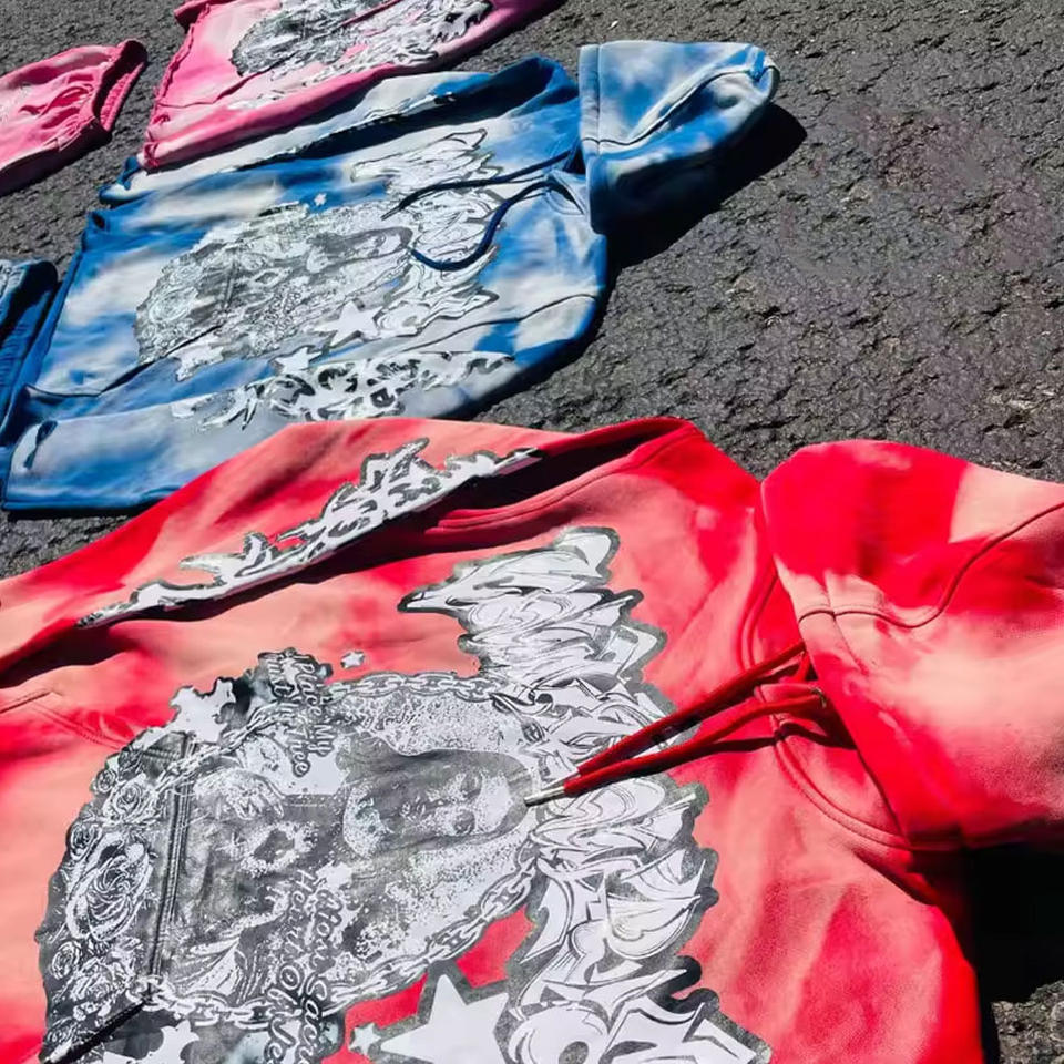 ชุดวอร์มกางเกงเอวสองชั้นและสติกเกอร์ปักลายมีฮู้ดชุดวอร์มพิมพ์ลายวินเทจสีสเปรย์ฟอกสี