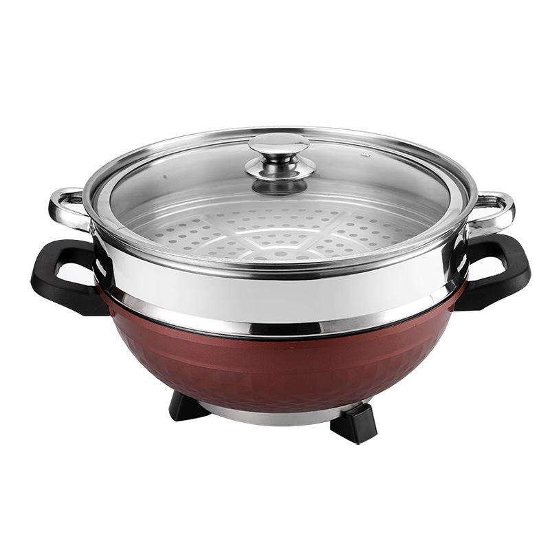 กระทะไฟฟ้า OEM ขนาด 34 ซม. 36 ซม. ทรงกลม สีเงินเทา สีแดงไวน์ หม้ออเนกประสงค์พร้อมฝาปิด สำหรับตุ๋นและทอด