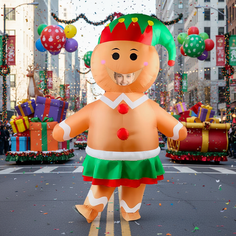 ชุดคอสเพลย์เป่าลมรูปมนุษย์ขนมปังขิง OEM สำหรับผู้ใหญ่/ฮาโลวีน/ปาร์ตี้คริสต์มาส/วันขอบคุณพระเจ้า