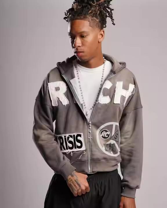 เสื้อมีฮู้ดของผู้ชายผ้าฟลีซคอตตอน100% ปักลายสไตล์วินเทจ