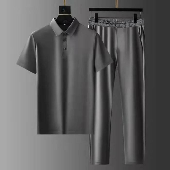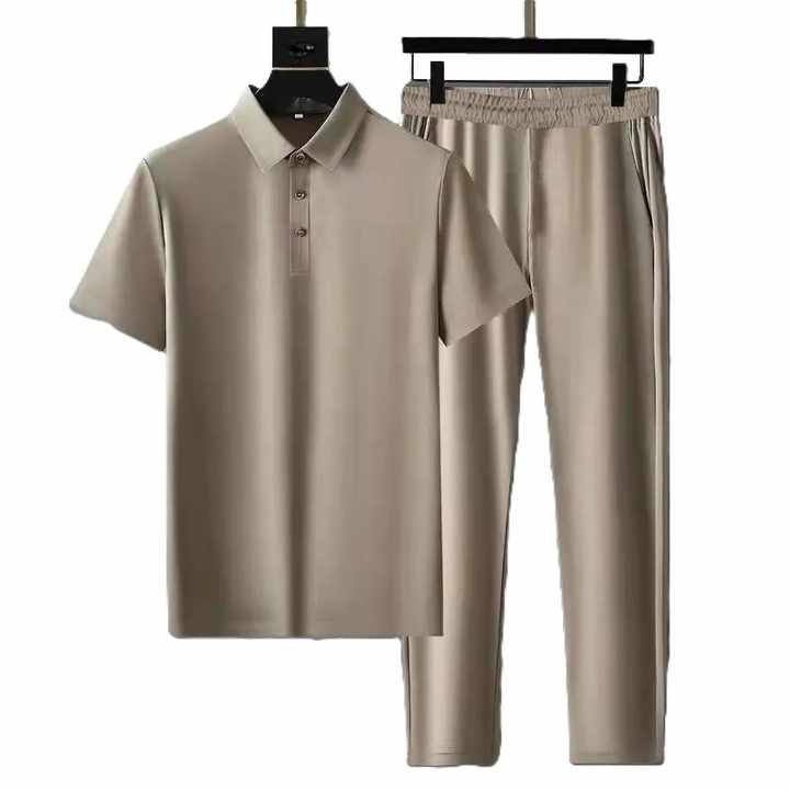ชุดสูทคอปกโปโลแบบสั่งทำจากโรงงาน OEM สำหรับผู้ชาย ผ้าไหมน้ำแข็งบางพิเศษ แห้งเร็ว แขนสั้น ชุดสองชิ้น ชุดสูทปกเสื้อเชิ้ต