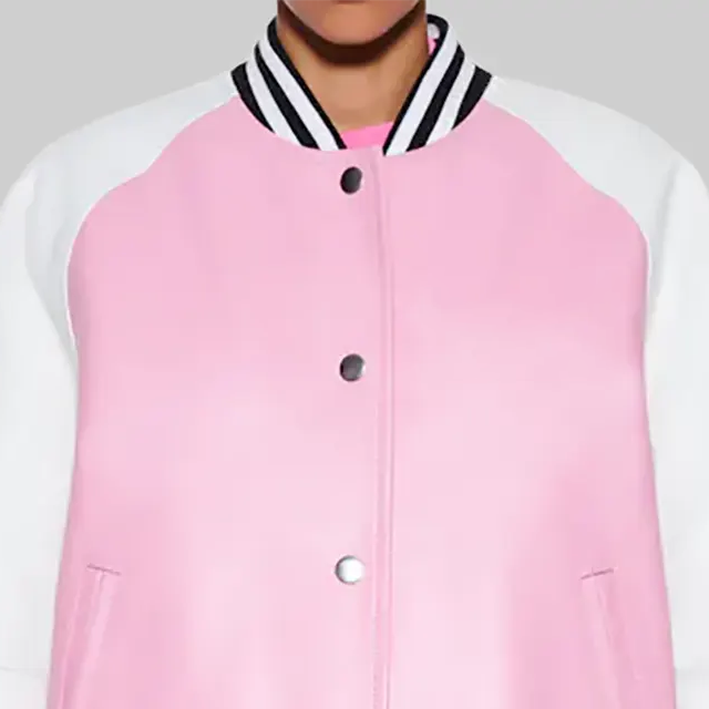 เสื้อแจ็กเก็ตทีมเบสบอลสำหรับผู้ชายเสื้อบอมเบอร์เสื้อโค้ทแบบลำลองแขนสีขาวสีชมพูแบบสตรีท