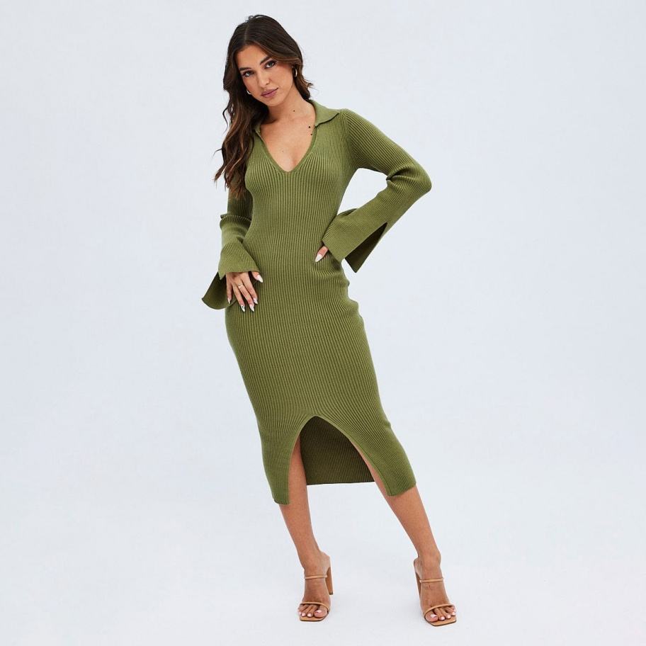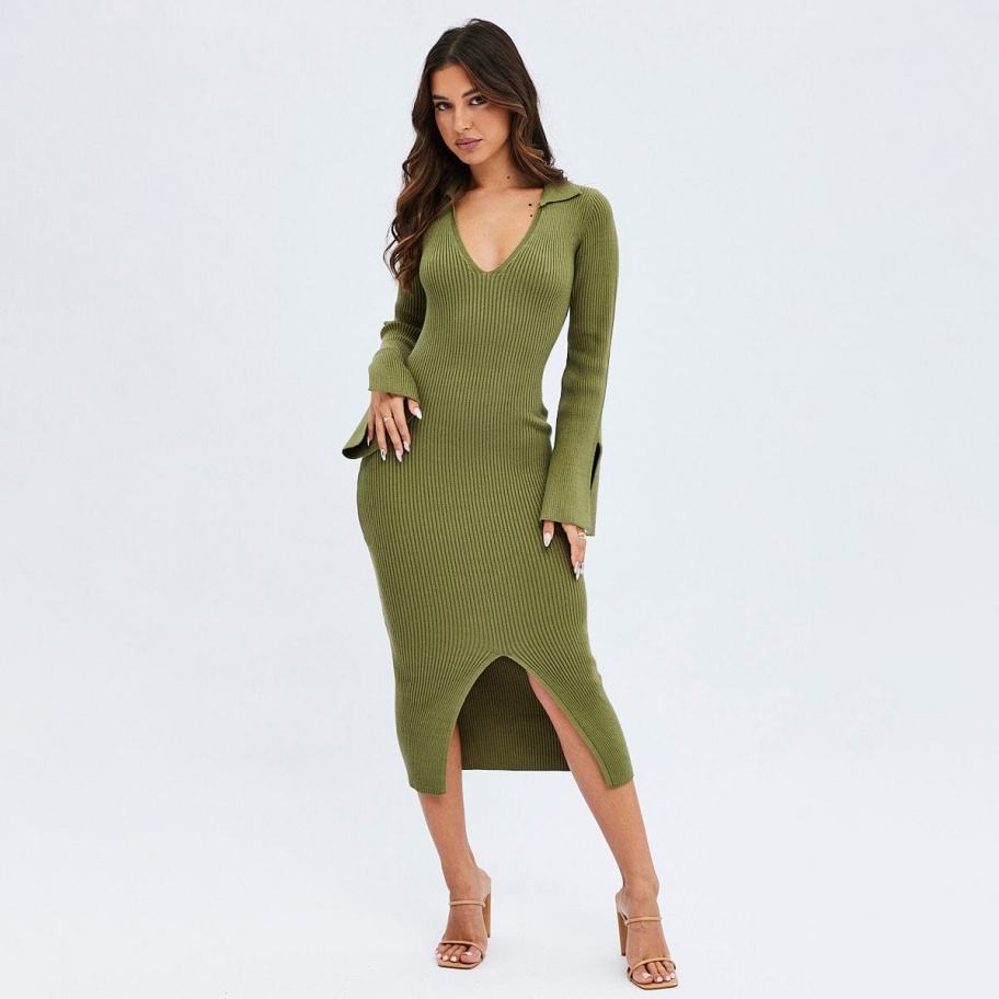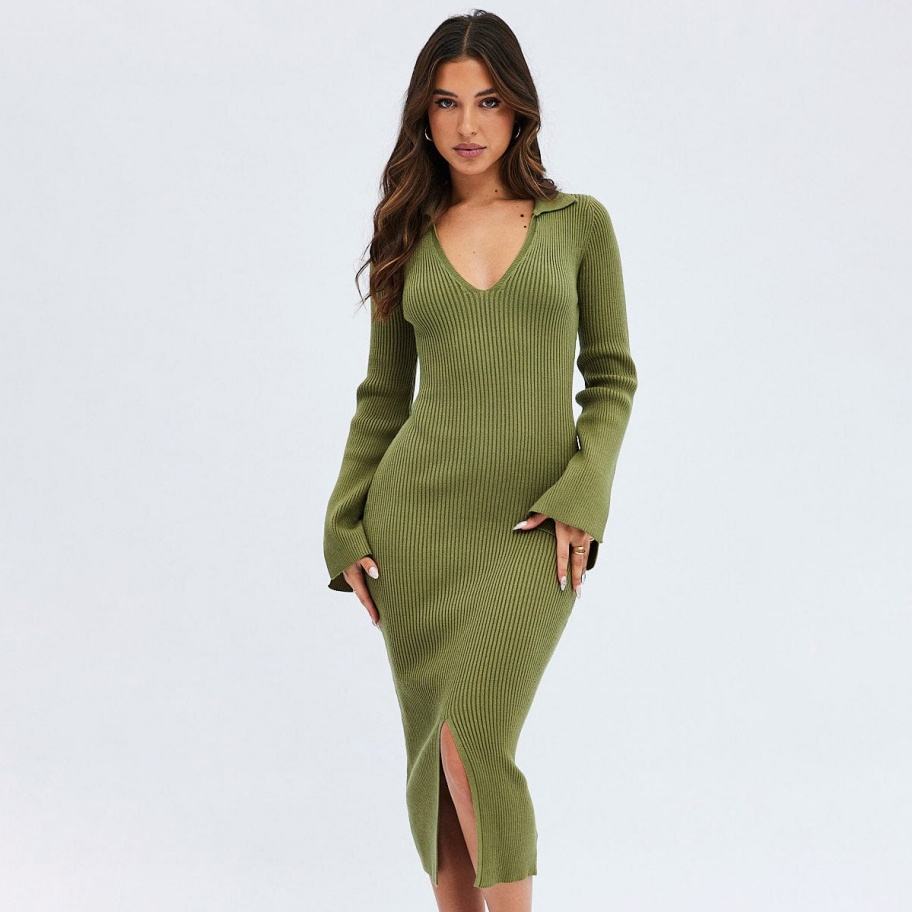 โรงงาน OEM ผลิตเสื้อถักคอวี แขนยาว สำหรับฤดูหนาวและฤดูใบไม้ร่วง ชุดเดรสไหมพรมยาว ดีไซน์หรูหรา