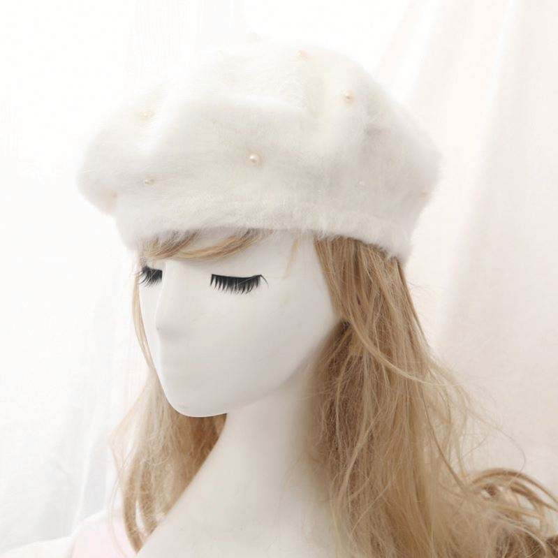 หมวกเบเร่ต์ฝรั่งเศสขนสัตว์สีทึบพร้อมไข่มุก