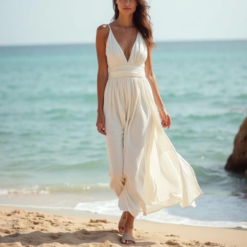 เดรสยาวสีขาวสไตล์ OEM แฟชั่นทันสมัย สง่างาม เหมาะสำหรับใส่ไปชายหาด ช่วงฤดูร้อน สำหรับผู้หญิง แบบไม่มีแขน คอวี น้ำหนักเบา เหมาะสำหรับใส่ไปเที่ยวพักผ่อน