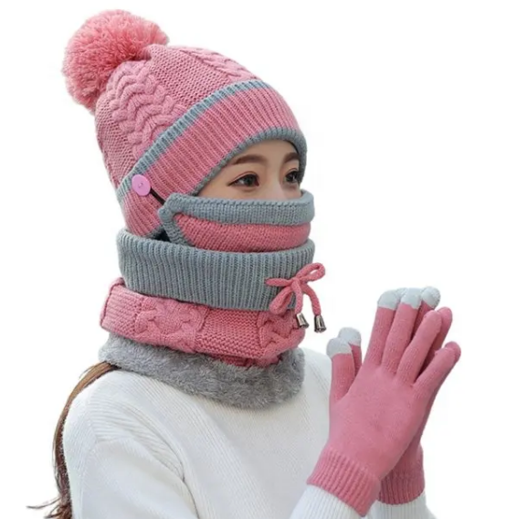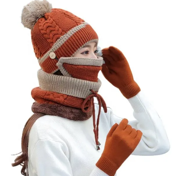 ชุดหน้ากากผ้าพันคอผ้าฟลีซสำหรับผู้หญิงหมวกถักไหมพรมพร้อมพู่สำหรับหน้ากากสกีและที่ปิดหู