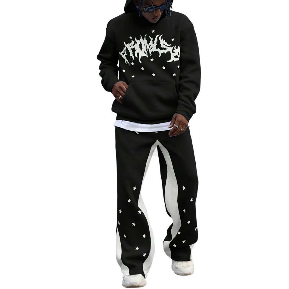 ชุดกีฬาผู้ชายสไตล์เรโทร 2 ชิ้น ผ้าฝ้าย 100% ลายดาวพองตัวทรงเอวสูง ขาบาน พร้อมฮู้ด