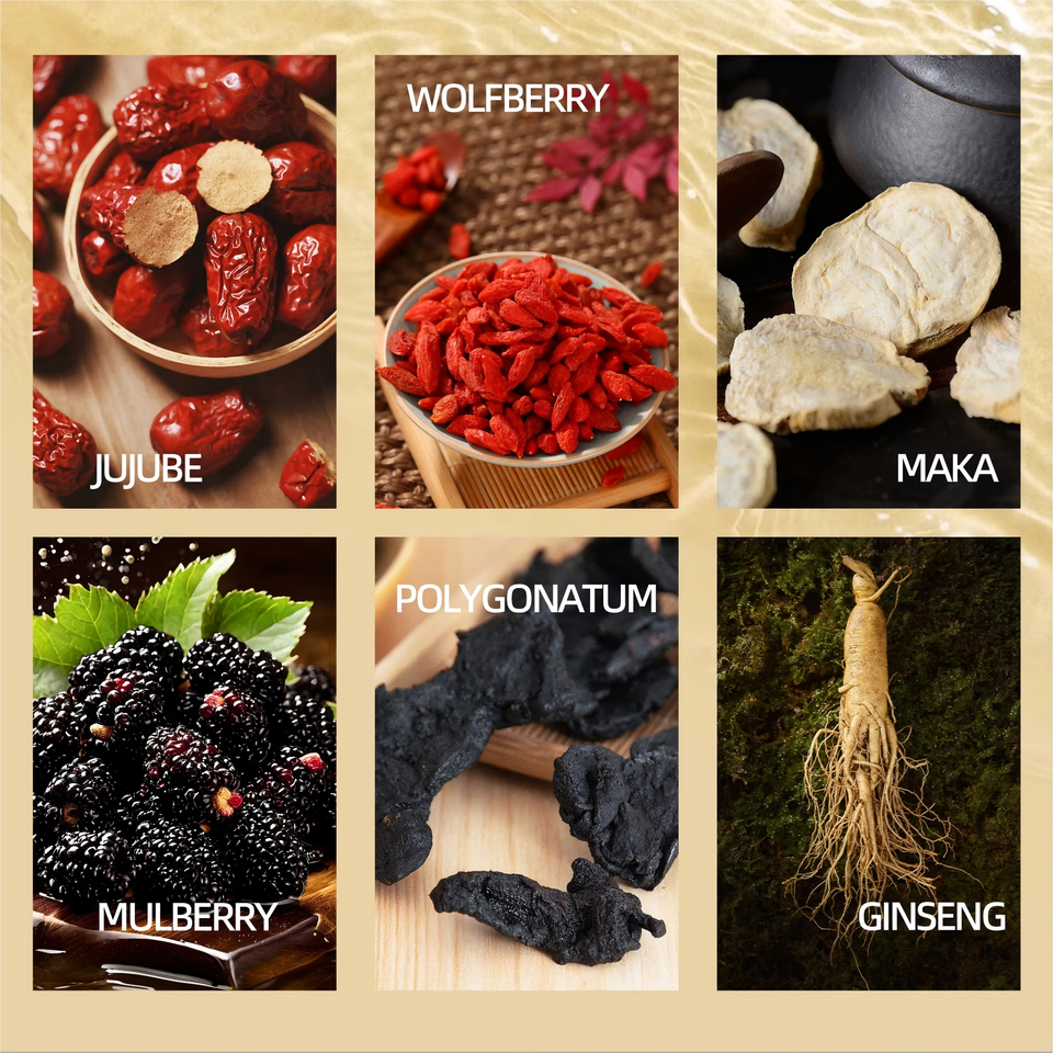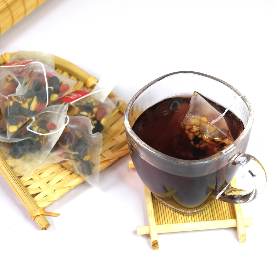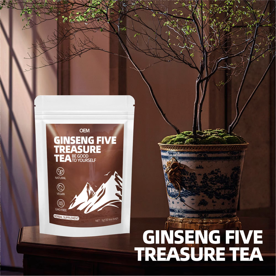 ชาสมุนไพรโสมห้าสมบัติ OEM ผสมโกจิเบอร์รี่ พุทรา มะคา โพลีโกนาทัม มัลเบอร์รี่ ออร์แกนิค อาหารเพื่อสุขภาพ เกรดวีแกน 20 ซองชา ขนาด 5 กรัม