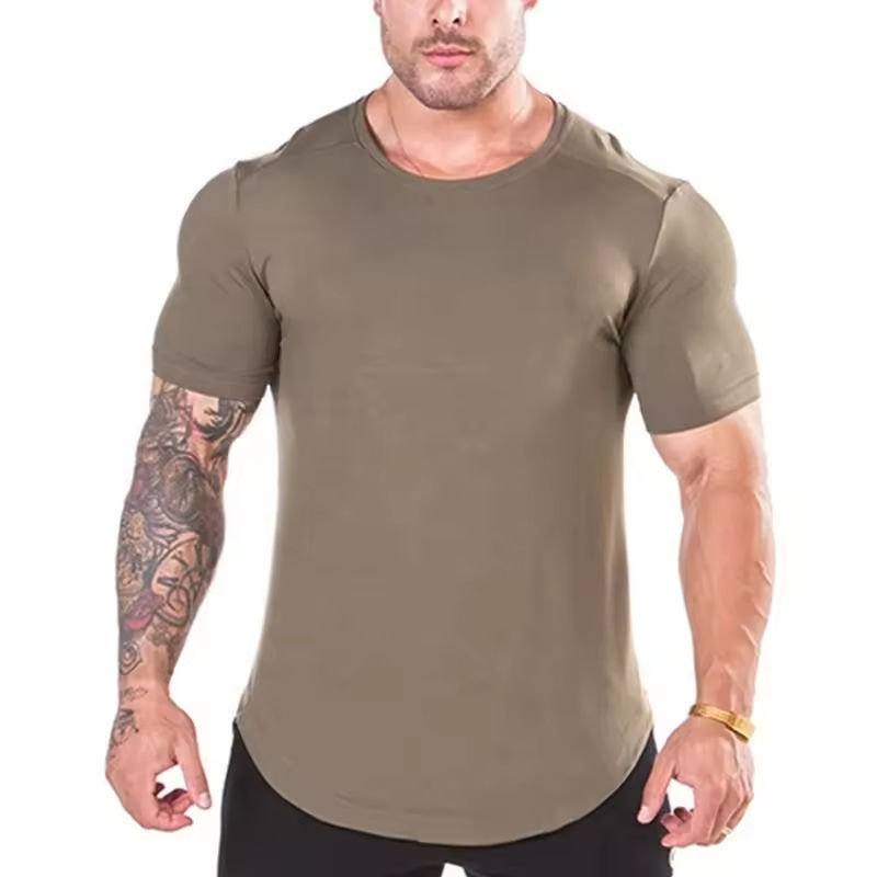 เสื้อยืดออกกำลังกายกล้ามเนื้อสแปนเด็กซ์ของผู้ชายเสื้อยืดฟิตเนสเข้ารูปแบบเรียบผ้าโพลีเอสเตอร์ยืดหยุ่นได้