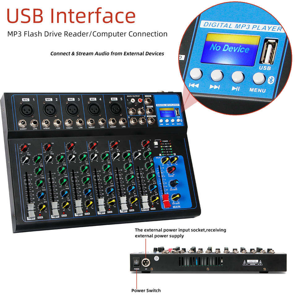 มิกเซอร์เสียงระดับมืออาชีพ OEM HT7 แบบพกพา พร้อมพอร์ต USB เครื่องเล่น MP3 ดิจิตอล 7 ช่องสัญญาณ คอนโซลมิกซ์เสียงสำหรับดีเจ เหมาะสำหรับการแสดงสด