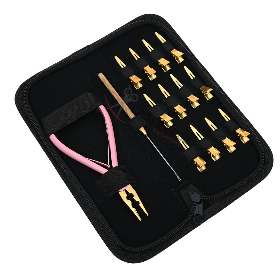 OEM Hair Extension Tools Kit with 2 Hole Micro Ring Stainless Steel Crimping Pliers Bead Threading Hook & Sectioning Clips